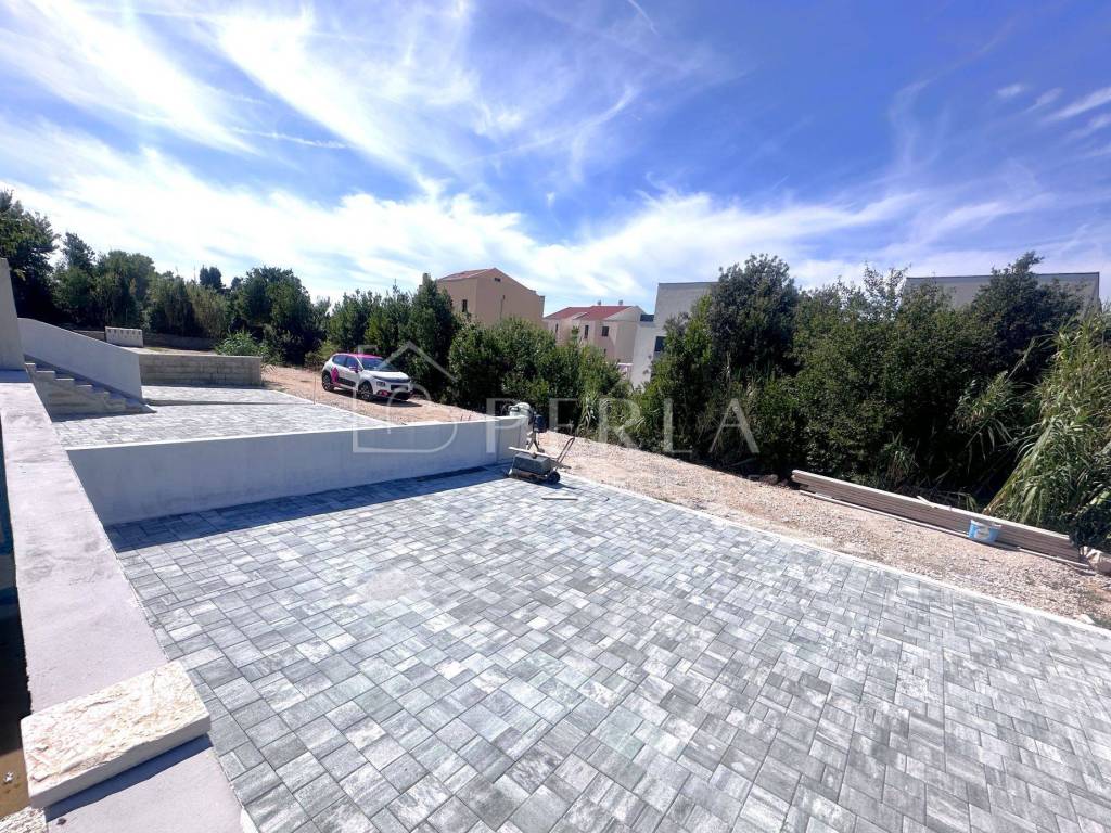 A modern duplex house under construction with a swimming pool with a total living area of 133 m2 is for sale in an excellent location in Privlaka, with a fantastic view of the sea.