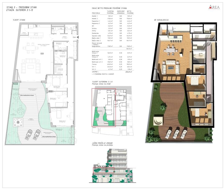 stan 3/suteren 3 (-1) = 161,10 m2 + terasa 112,28 m2 + 3 garažna parkirna mjesta