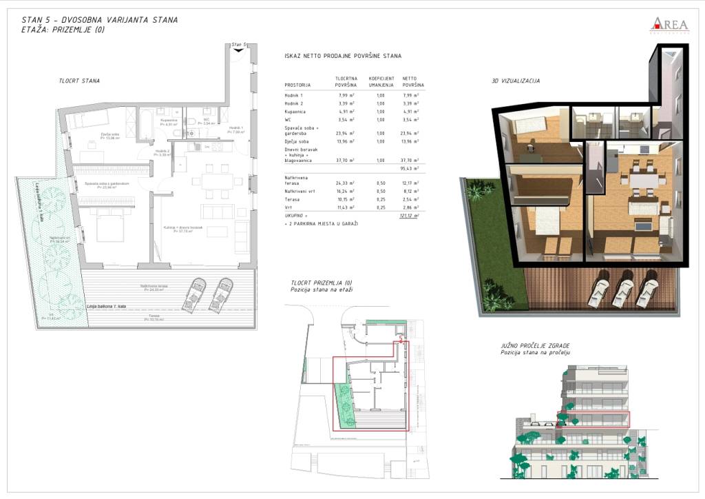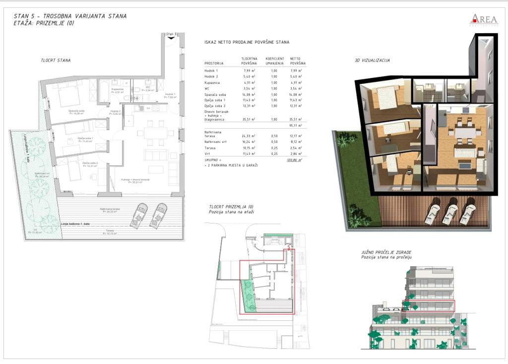 Stan 5 = 95,2 m2 ( prizemlje = 0), trosobni stan sa dnevnim boravkom i terasom od 62,24 m2, 2 garažna parkirna mjesta, obračunska kvadratura = cca 120,86 m2.