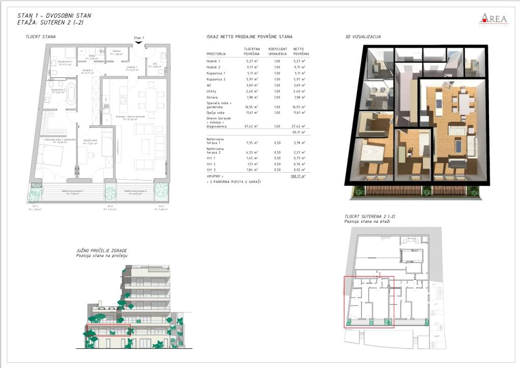 stan 1/suteren 2 (-2) = 99,70 m2 + terasa 16,47 m2 + 2 garažna parkirna mjesta