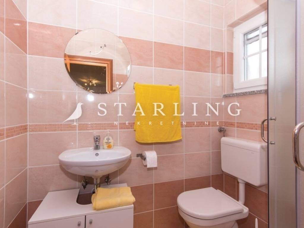 The exterior of the property offers complete privacy, as the garden is fully enclosed and hidden from view. The land on which the villa is situated is 296 m², which is convenient as it requires minimal maintenance. Within the garden, there is parking for three cars with a movable wrought-iron fence, as well as an outdoor pool with a sunbathing area, ideal for relaxation. Additional space includes a covered terrace with a summer kitchen and barbecue, perfect for outdoor gatherings and meals during warm summer evenings.