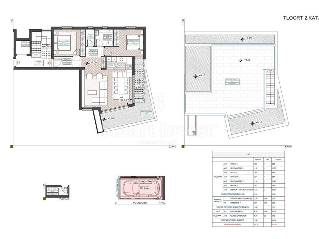 IČIĆI NEW EXCLUSIVE 2-BEDROOM APARTMENT WITH ROOF TERRACE AND SEA VIEW! For sale is an exclusive apartment with a spacious balcony, roof terrace and sea view in a superb new building with a garage and elevator, in an very attractive location near the sea, beaches and ACI marina. This superb new building with a total of 6 apartments exudes contemporary design and elegance, and is made of the highest quality materials, which guarantees durability and quality. Located in an extremely attractive location just a few minutes' walk away from the beaches and the marina, this property offers you modern design, luxurious elegance and comfort, and with its modern architectural style and the finest materials, it sets new standards for modern housing. APARTMENT A3 • floor: second floor • 2 bedrooms, 1 bathroom • total area of ​​the apartment with secondary parts: 161.29 m2 • total net area of ​​the apartment with secondary parts (with coefficients): 101.89 m2 • internal area of ​​the apartment: 70.61 m2 • covered balcony: 19.43 m2 • roof terrace: 56.25 m2 • 2 parking spaces with a multi-parking system, marked PM 9-10: 12.50 m2 • storage room marked 4: 2.50 m2 At your disposal is an entrance corridor, a living room with kitchen and dining area with access to a covered balcony, two bedrooms, a bathroom and a storage room. But what makes this apartment special is the spacious roof terrace with stunning sea views - a real oasis for enjoying the outdoors. The apartment also has a storage room and two parking spaces with a multi-parking system in the garage, which provides additional convenience. The excellent micro-location, just a few minutes walk from the beaches and marina and a few minutes drive from the center of Opatija, makes this property the perfect choice for those looking for a luxurious apartment by the sea for family life or vacation or a prestigious property for investment in tourist rentals. PRICE The listed price refers to a completely finished apartment on a turnkey basis, without furniture. The price includes VAT, the buyer is exempt from paying real estate tax. In the case of purchase from a company registered in Croatia, a full VAT refund is possible after the purchase. For more information and a viewing appointment, call: +385/99/320-0008 ID CODE: 16076 Agencija Opatija Ovlašteni posrednik Mob: +385/99/320-0008 E-mail: office@smart-invest.hr www.smart-invest.hr