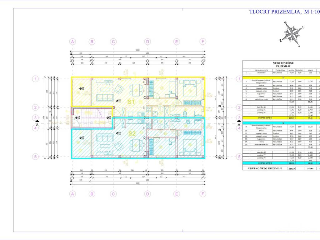 Apartman S1: kuhinja, dnevni boravak i blagovaonica 27,64m2, hodnik 3,06m2, 2 spavaće sobe (7,42m2, 9,50m2), kupaonica 5,13m2, vešeraj 2,73m2, natkrivena terasa 3,58m2, dvorište 6,146m2, 2 parkirna mjesta (2,750m2, 2,500m2) Ukupno: 70,45m2 Cijena: 250.097,00 EUR (3550 EUR/m2)