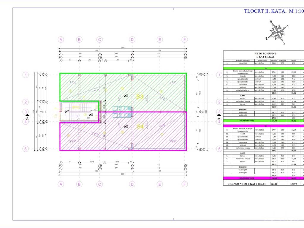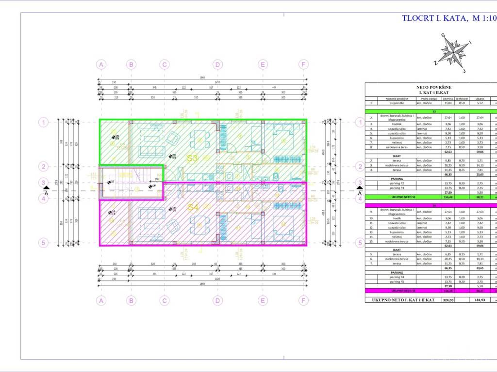 Apartman S4: kuhinja, dnevni boravak i blagovaonica 27,64m2, hodnik 3,06m2, 2 spavaće sobe (7,42m2, 9,50m2), kupaonica 5,13m2, vešeraj 2,73m2, apartmanu pripadaju 2 terase (1,71m2, 7,87m2) te natkrivena terasa 14,13m2 na drugom katu, 2 parkirna mjesta (2x 2,75m2) Ukupno 88,21m2 Cijena: 344.019,00 EUR (3900 EUR/m2)
