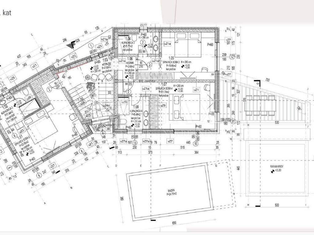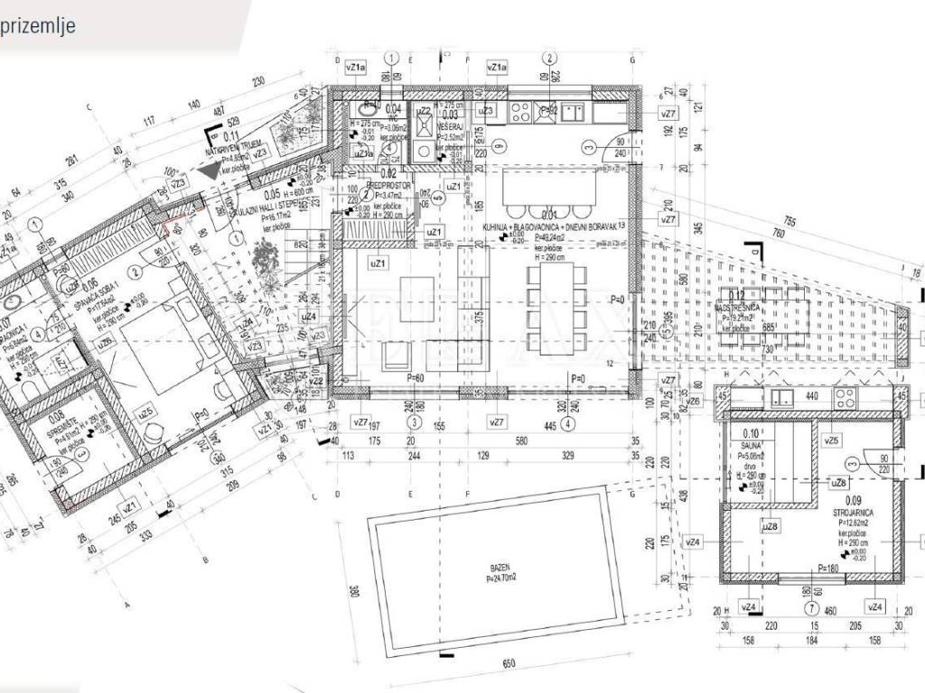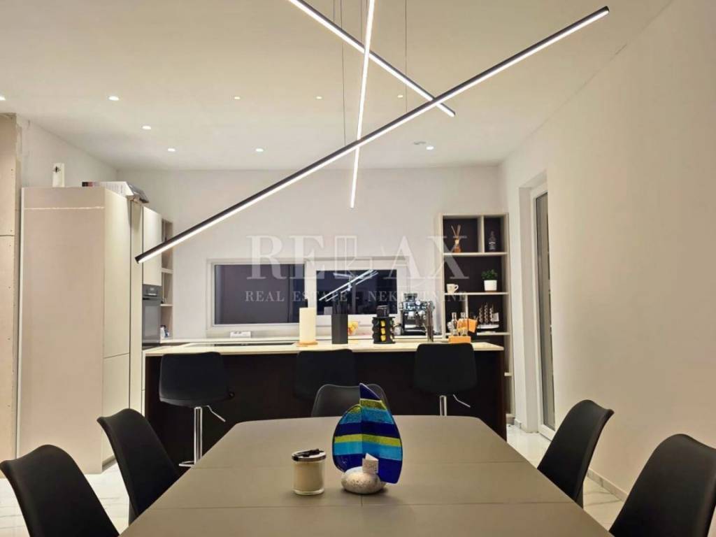 La villa si sviluppa su due piani – piano terra e primo piano – ed è in vendita completamente arredata, secondo il principio "chiavi in mano". Al piano terra si trova un ampio soggiorno open space collegato alla cucina e alla sala da pranzo, con accesso diretto alla terrazza curata e alla piscina con acqua salata, dotata di sistema di manutenzione automatica e predisposizione per l'installazione di una pompa di calore. Inoltre, al piano terra ci sono anche un bagno per gli ospiti con lavanderia, una camera da letto, un bagno, un ingresso e un ripostiglio.