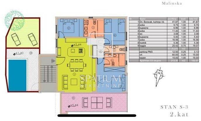 MALINSKA, ISOLA DI KRK, proponiamo un appartamento con giardino situato al piano terra di un nuovo edificio. La superficie totale dell'immobile è di 164,02 m2, ovvero l'appartamento, che misura 120,39 m2 netti, ha un giardino di 102 m2, una piscina di 15 m2 e un parcheggio di 12,50 m2. L'appartamento è composto da un ingresso, un ampio soggiorno con cucina e zona pranzo, tre camere da letto, di cui una con bagno en suite, un WC, un bagno e una loggia. Carpenteria interna di qualità Dierre, porte d'ingresso Inotherm, impianto di allarme e videosorveglianza, pavimenti in ceramica di prima scelta e sanitari "Karag" completano la dotazione dell'edificio. Sono stati installati il riscaldamento a pavimento e le unità di aria condizionata Mitsubishi montate a pavimento. Nel parcheggio si trova un caricabatterie per auto elettriche. L'edificio è una struttura in cemento armato con facciata autoventilata rivestita in lana di roccia. Infine, la facciata è rifinita in pietra e travertino e, grazie a questo e ad altri dettagli (illuminazione, recinzioni, soluzioni architettoniche), l'edificio appare estremamente bello. L'ampio giardino, pavimentato in pietra, è dotato di piscina, cucina estiva e predisposizione per doccia esterna. Una strada tranquilla, la vicinanza al centro e al mare rendono questa proprietà interessante da vivere, per soggiorni occasionali o come investimento turistico. "Malinska è la perla delle isole del Quarnero", scrisse nel 1905 il professore dell'Università di Vienna, L. Waagen. Il turismo, oggi la principale attività economica, ebbe inizio a Malinska a cavallo tra il XIX e il XX secolo, grazie allo sviluppo della ferrovia e dei trasporti via vapore. I primi ospiti registrati furono cacciatori, aristocratici austriaci e ungheresi e patrizi fiumani. Arrivarono nella zona attorno a Malinska per cacciare beccacce e altra selvaggina da penna. La cultura mediterranea, come quella delle isole croate, è intrisa di famiglia, architettura, musica e cibo: la sua coltivazione, lavorazione, preparazione e consumo. Poiché la popolazione locale si dedicava alla pesca e alla coltivazione di ulivi, uva, fichi e pecore, questa tradizione è stata coltivata e oggi rivive con orgoglio. Gli interessanti e diversificati dintorni di Malinska svelano numerose attrazioni naturali e antichi siti storici che risalgono a tempi antichissimi. Per ulteriori informazioni, contattateci con fiducia. Azalea Kegalj agente autorizzato +385 95 905 5464 azalea@spatium.hr Spatium nekretnine +385 51 272 903 info@spatium.hr