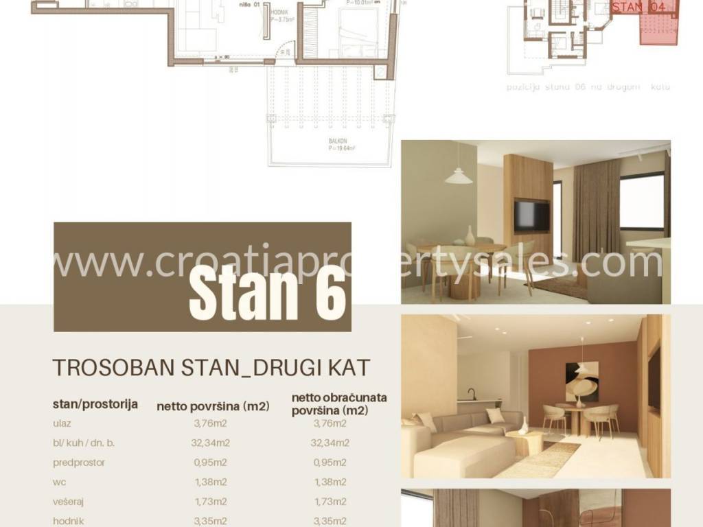 A new build property in our offer.Modern building with 6 apartments in total, located just 350 m from the sea in a nice location on Čiovo island. It is still under construction but close to completion. At the moment, 4 apartments are for sale, the ones on the 1st and 2nd floor. They range from 87 m2 to 115 m2 of gross area. Although they vary in size, each apartment has 2 bedrooms and 1 larger bathroom, with a guest toilet and laundry, kitchen and living room area, and from 2 to 3 balconies. Each apartment will be sold finished but without furniture included. FIRST FLOOR:S3 – 2 bedrooms, 1 bathroom, guest toilet, laundry room, hallway, kitchen/dining room and living room – 84,22 m2 + loggia 11,55 m2, balcony 10,94 m2 and 8,74 m2 – 431.200€ S4 - 2 bedrooms, 1 bathroom, guest toilet, laundry room, hallway, kitchen/dining room and living room – 83,73 m2 + balcony 13,20 m2 and 6,56 m2 – 373.800€ SECOND FLOOR:S5 – 2 bedrooms, 1 bathroom, laundry room, hallway, kitchen/living room/dining room – 58,56 m2 + balcony 36,28 m2 and 2,40 m2 – PRICE ON REQUEST S6 - 2 bedrooms, 1 bathroom, guest toilet, laundry room, hallway, kitchen/dining room and living room – 66 m2 + balcony 19,64 m2 + 2,25 m2 – 307.450€Each apartment will get one allocated parking space. Quality materials were used in construction, to ensure the best quality of living. Given that the location is close to the sea and center of this area, it can be a nice retreat, with all amenities close by.