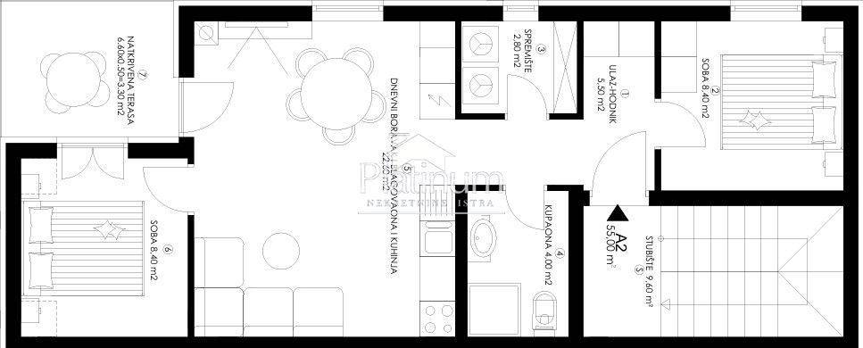 U Puli u započetoj gradnji prodaje se stan na prvom katu koji se sastoji od ulaznog hodnika, kupaone,dnevnog boravka s kuhinjom i blagovaonom, dvije spavaće sobe,ostave i natkrivene terase. Stanu u cijeni pripada spremište i parkirno mjesto.