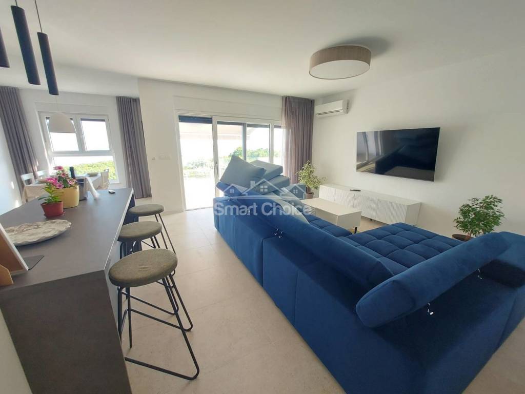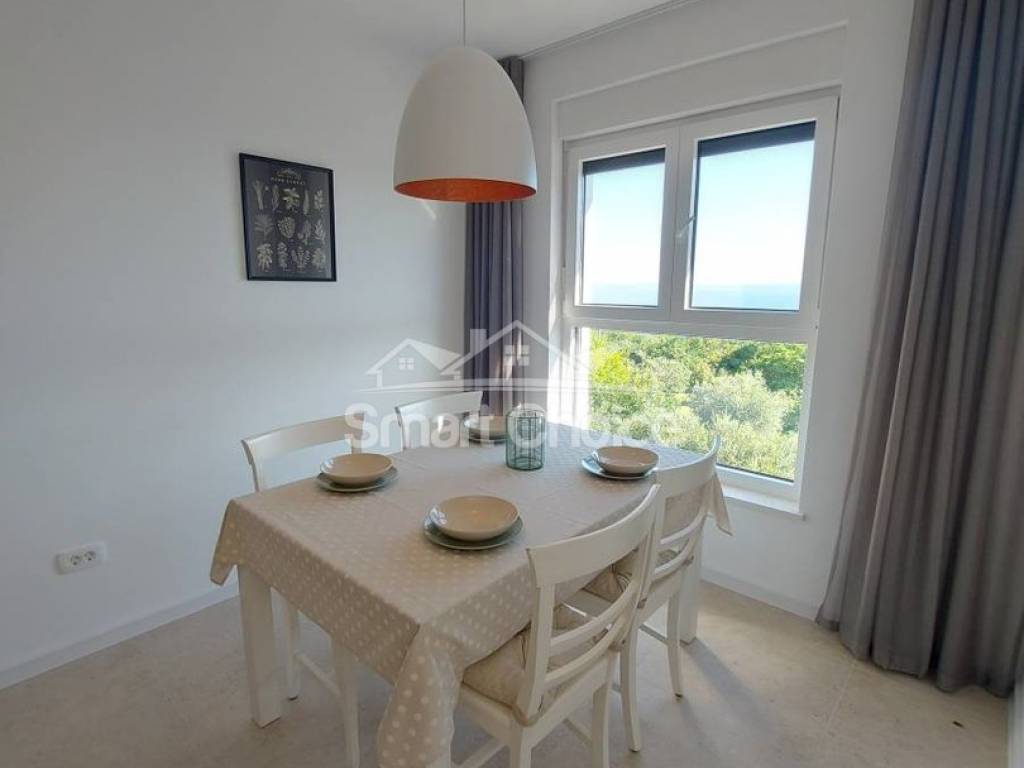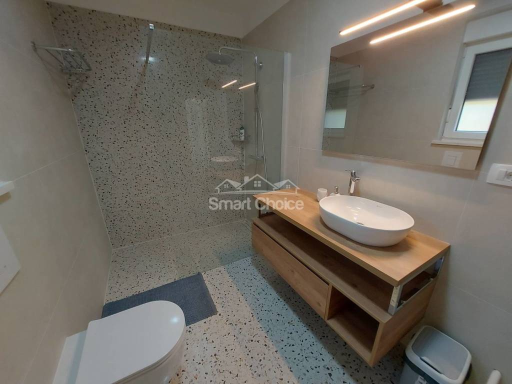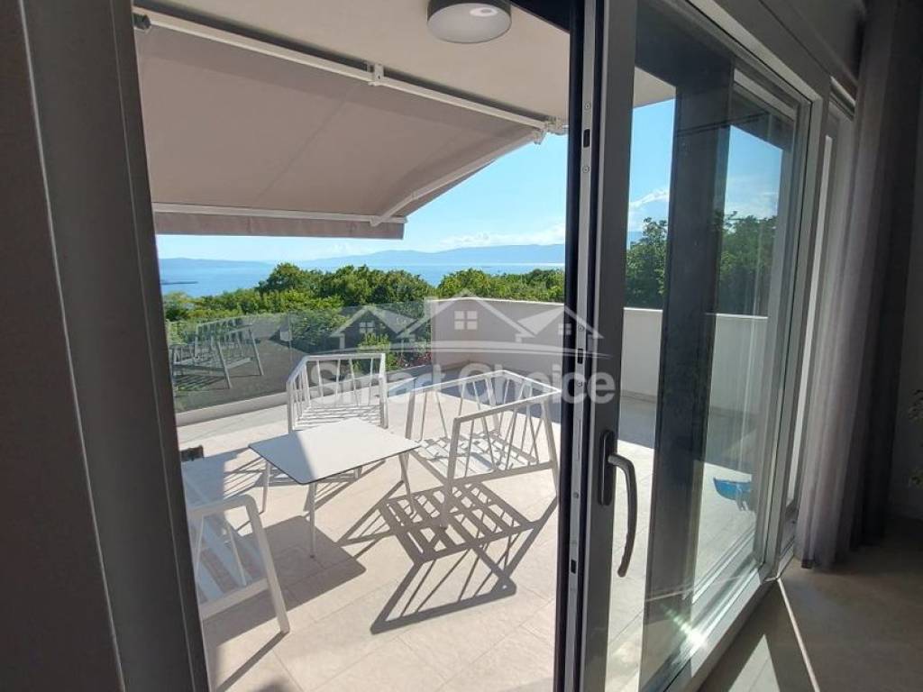 Kostrena - ekskluzivna etaža kompletno novoopremljena i nekorištena u novosagrađenoj vili s bazenom i prekrasnim pogledom na more i zelenilo. Stan ima vlastiti ulaz i sastoji se od velikog dnevnog boravka spojenog s kuhinjom i blagovaonom i izlazom na natkrivenu terasu, 2 sobe od kojih jedna ima walk-in garderobu, vlastitu kupaonicu i balkon, još jedne kupaone i vešeraja. Korištenje bazena je u cijeni najma. Grijanje/hlađenje na klime, wi-fi, parking za više auta. Mirna i tiha lokacija. Stan se iznajmljuje dugoročno. Mogućnost najma garaže. Petra 098429024