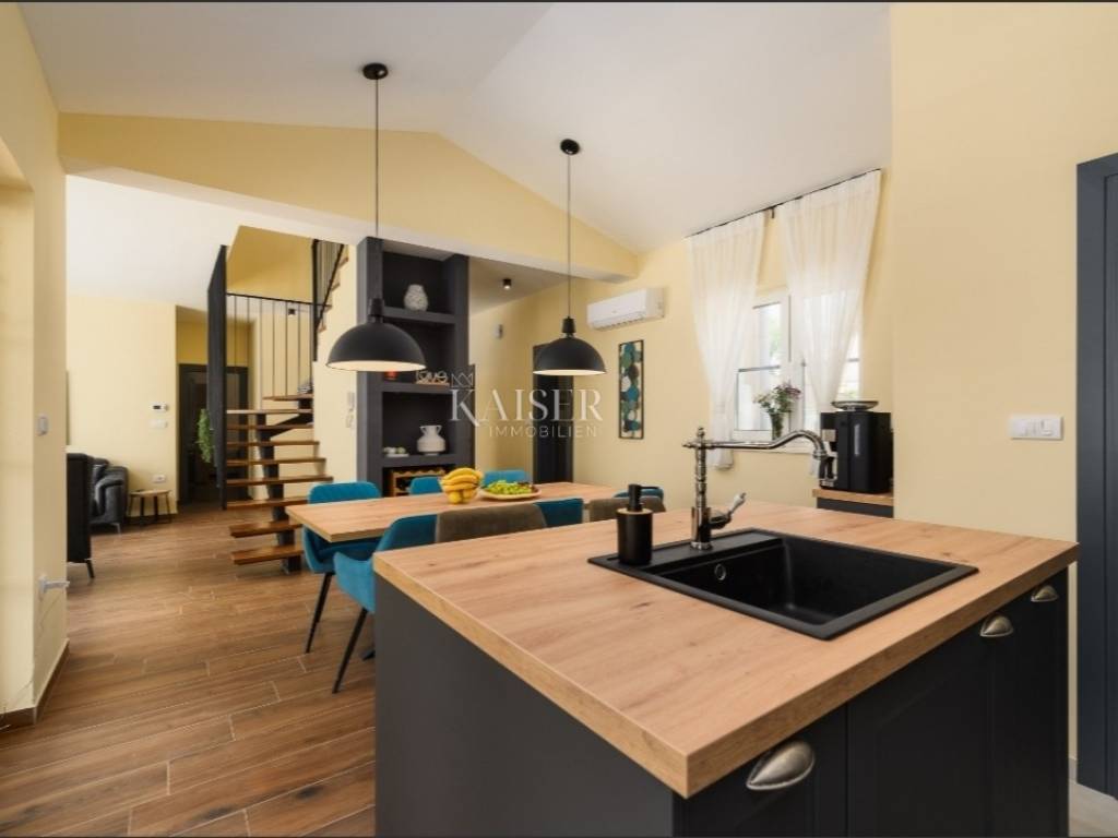 Kaiser Immobilien presenta una bellissima villa con piscina in un'ottima posizione. La casa è stata completata nel 2023 ed è stata costruita secondo i più alti standard di costruzione e le normative UE. La casa è stata progettata in Istria, cioè nello stile italiano delle ville a un piano, e ha una superficie di 186 m2 con piscina (9,5 mx 4 m). La casa principale è composta da un piano terra con due camere da letto e bagni, un soggiorno con sala da pranzo, una cucina e una camera da letto al piano superiore, anch'essa con bagno. Oltre a quanto sopra, nella parte principale della casa c'è un ingresso separato per un'unità abitativa più piccola, vale a dire un monolocale (25 m2) completamente attrezzato con cucina, soggiorno e bagno. Allo stesso tempo, in quella parte della casa e del cortile si trova una sala macchine con attrezzature per la piscina e un locale caldaia con attrezzature per il riscaldamento della casa e dell'acqua sanitaria. La casa è isolata dall'esterno con una facciata in demit di 10 cm di spessore e alcune parti della casa sono in pietra. La casa ha il tetto ventilato in modo che il sottotetto non si riscaldi d'estate, l'aria fredda entra dal basso ed esce attraverso le aperture nella parte superiore del tetto in modo che la temperatura non venga trasferita all'interno della casa. Tutti i pavimenti sono coibentati con impermeabilizzazione, così come i vialetti attorno alla casa e la zona prendisole attorno alla piscina. E' possibile riscaldare la casa con riscaldamento a pavimento nel periodo invernale, acqua sanitaria tutto l'anno, e piscina nel periodo transitorio primavera-autunno per prolungare la stagione estiva. Nel soggiorno è presente un camino da 25 kw, il quale è predisposto per poter riscaldare il riscaldamento a pavimento e l'acqua sanitaria, tutti gli impianti vengono lasciati solo al necessario, è necessario un magistrale collegamento all'impianto esistente. Ogni stanza della casa ha il proprio condizionatore inverter che raffredda e riscalda. La cucina con isola è stata ordinata in Germania al produttore "Moderno" ed è stata realizzata su misura. I sanitari e la rubinetteria sono realizzati dal produttore tedesco GROHE e Willeroy & Boch. Tutte le ceramiche, le piastrelle dentro e intorno alla casa, così come in piscina, sono realizzate da produttori spagnoli e italiani. Ogni stanza ha il proprio termostato digitale, attraverso il quale la temperatura di quella stanza viene regolata individualmente. C'è una cucina estiva in pietra sull'ampia terrazza, il verde del giardino è sempre fresco perché è presente un sistema di irrigazione con irrigatori per l'erba e un sistema di irrigazione a goccia per il lauroceraso che circonda parte del giardino intorno alla piscina e dà intimità alle case gotiche. La casa ha un permesso d'uso, è registrata e ha una classificazione a tre stelle per l'affitto. Aeroporto di Pola -25 km Aeroporto di Portorose -45 km Aeroporto di Rijeka -58 km Il centro di Rovigno dista solo 15 km. Per ulteriori informazioni, contattare un agente.