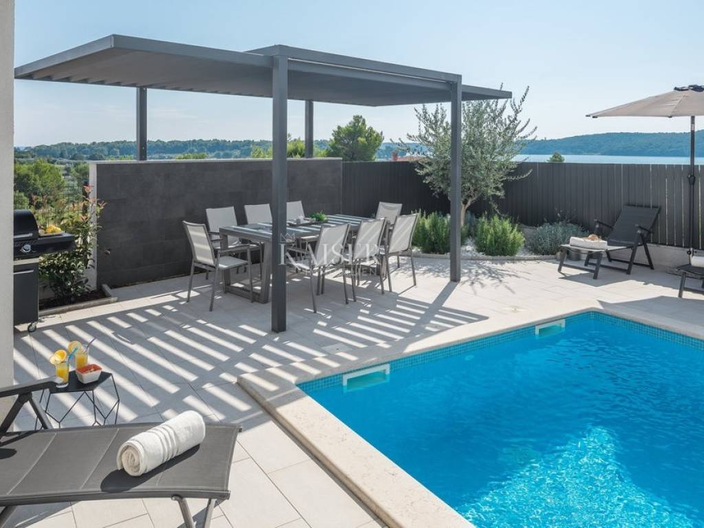 Kaiser immobilien media la vendita di una casa di lusso nel sud dell'Istria, a Medolino. La casa dispone di due appartamenti e di una splendida vista aperta sul mare, e si trova a soli 150 metri dalle bellissime spiagge. L'arcipelago di Medolino con 11 isolotti disabitati ricoperti di pinete e natura incontaminata, mare cristallino, numerose baie e promontori, tutto questo è l'ambiente in cui si trova questa proprietà. Situato su un terreno di 571 mq, con una superficie abitabile totale di 270 mq, l'edificio dispone di due appartamenti, di cui l'appartamento più grande è suddiviso su due piani. Al piano terra si trova un soggiorno con soggiorno, cucina e sala da pranzo. Al piano superiore ci sono quattro camere da letto e quattro bagni, oltre ad un terrazzo con una meravigliosa vista panoramica sul mare e sulle isole dell'arcipelago di Medolino. Il secondo appartamento è composto da una cucina con sala da pranzo e soggiorno, una camera da letto, un bagno, un terrazzo con piscina idromassaggio e vista mare. Nella costruzione e nell'arredamento della casa sono stati utilizzati materiali e attrezzature di alta qualità. Tutti gli ambienti sono climatizzati con dispositivi inverter. L'isolamento di 10 cm in combinazione con la carpenteria in PVC di alta qualità si traduce in un consumo energetico estremamente basso, come evidenziato dal certificato energetico A. I mobili sono in legno massiccio di alta qualità e l'edificio viene venduto attrezzato e arredato. Nel giardino ben curato si trova la piscina con zona solarium e doccia, oltre alla zona barbecue. Ci sono tre posti auto all'avvicinamento alla casa. CODICE Agenzia 105-186 La provvigione di agenzia per l'acquirente è del 3% + IVA e viene pagata in caso di acquisto immobiliare, alla conclusione del primo atto legale.