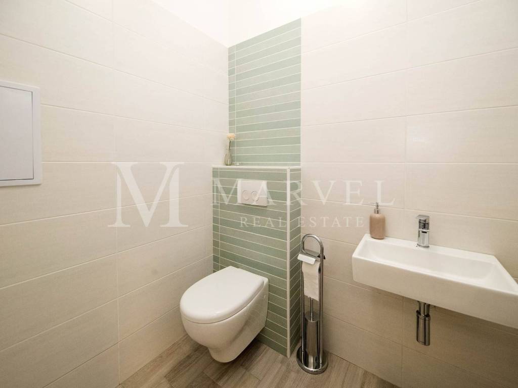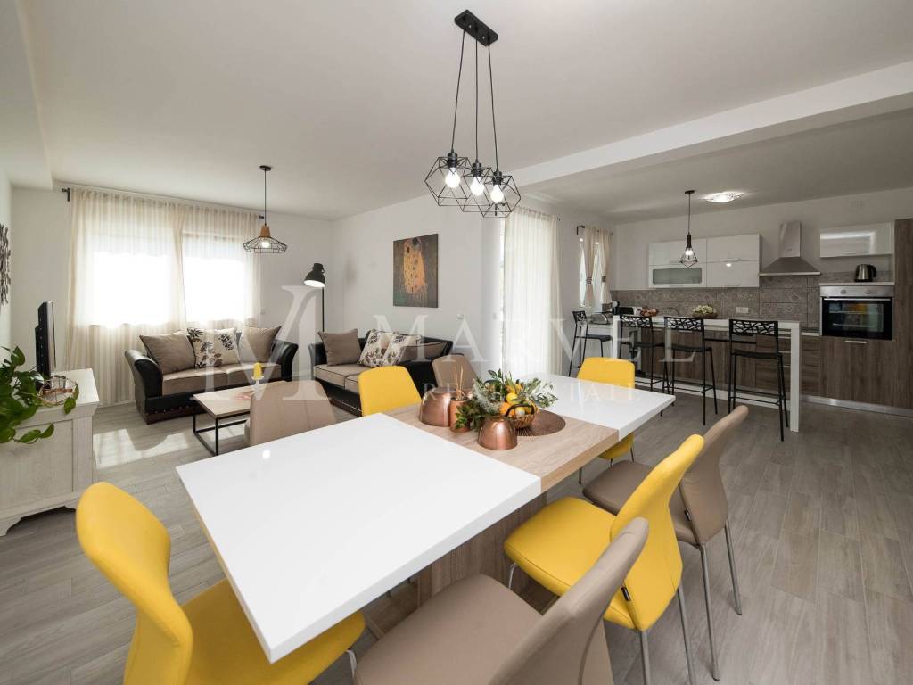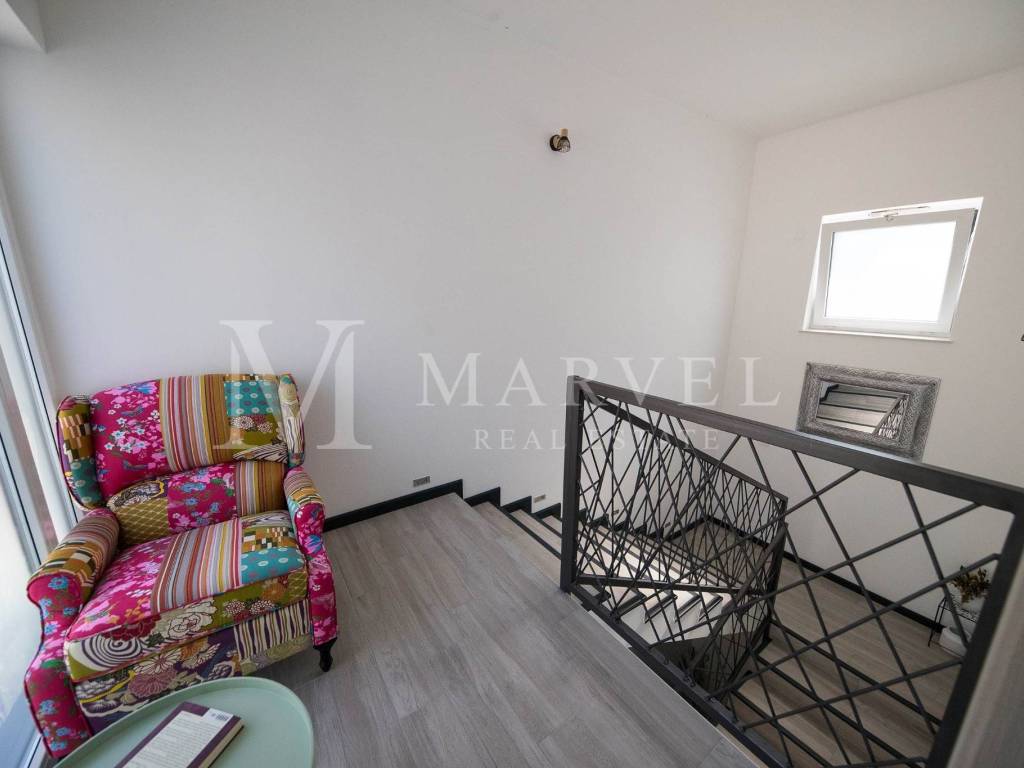 La casa è composta da cucina, sala da pranzo, soggiorno, quattro camere da letto, ciascuna con bagno privato, due WC, due balconi e una terrazza. Al seminterrato si trovano una piscina coperta, sauna e uno spazio per attività ricreative e di intrattenimento. Il seminterrato è collegato al giardino e alla terrazza, che include una cucina estiva e un barbecue, perfetti per incontri familiari e attività all'aperto.