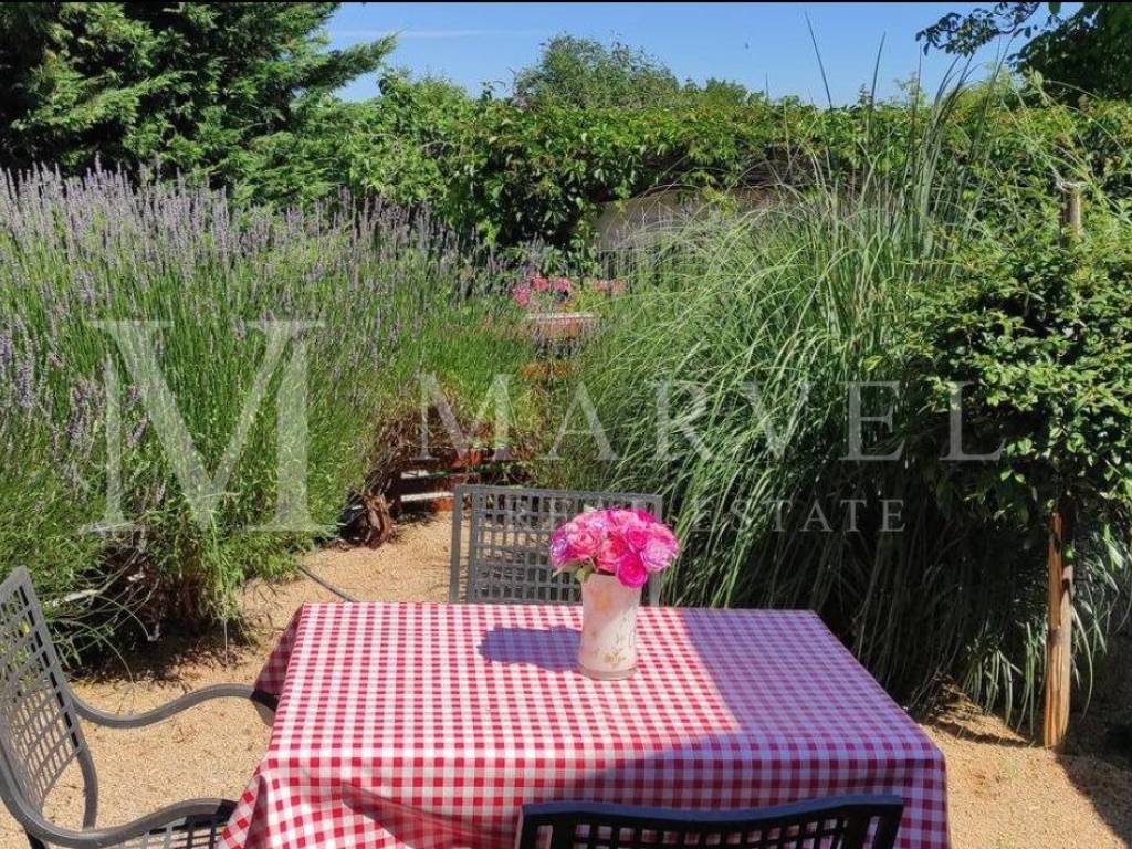 Il piano terra comprende una cucina, un soggiorno, un ripostiglio e una camera da letto con bagno privato e jacuzzi. Dal piano terra si accede a una terrazza coperta, che porta al giardino ben curato con una piscina, una zona sole e un'altra terrazza con barbecue.
