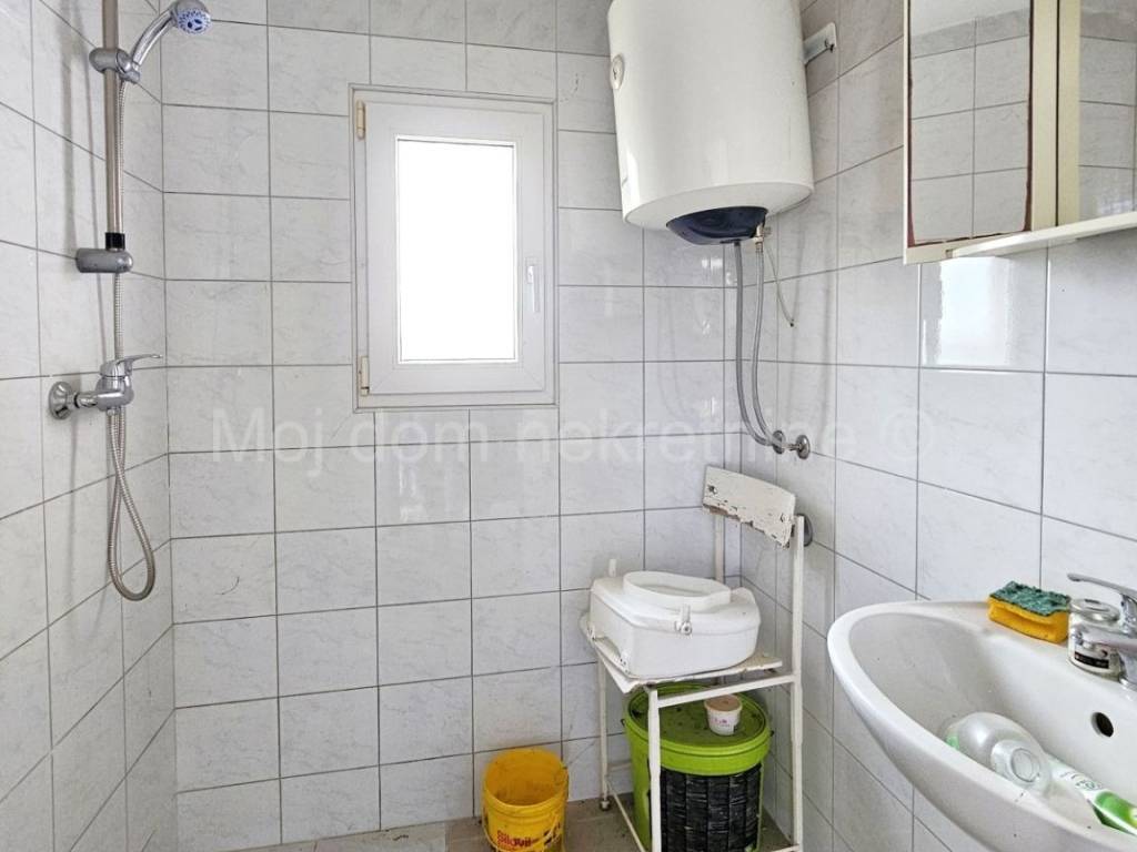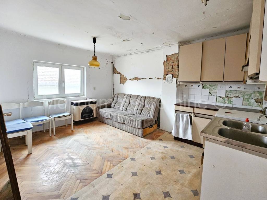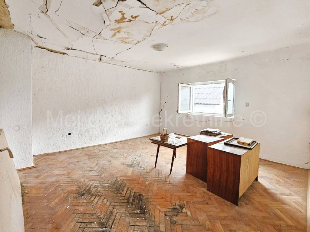 Kuća je nastradala u potresu (crvena naljepnica). Ima priključke vode, struje i plina te sabirnu jamu.