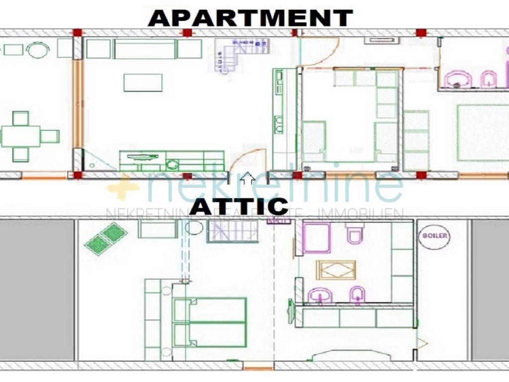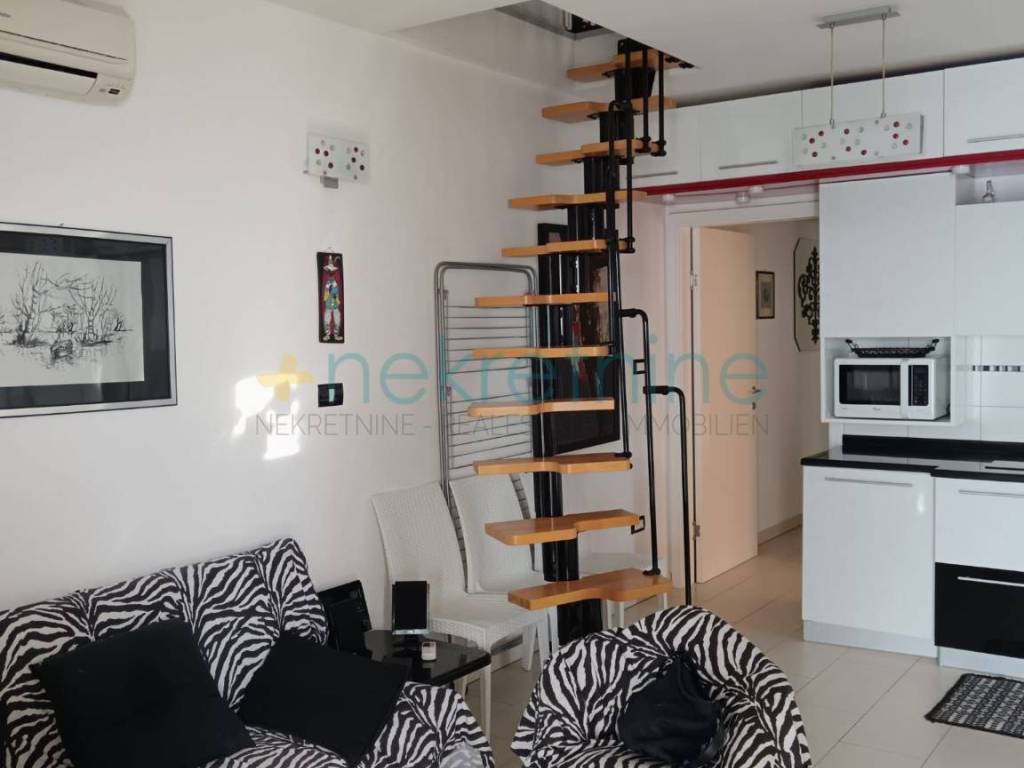 Ovaj impresivni penthouse smješten je na drugom katu manje stambene zgrade, a sastoji se od dvije etaže koje pružaju udoban i funkcionalan životni prostor.