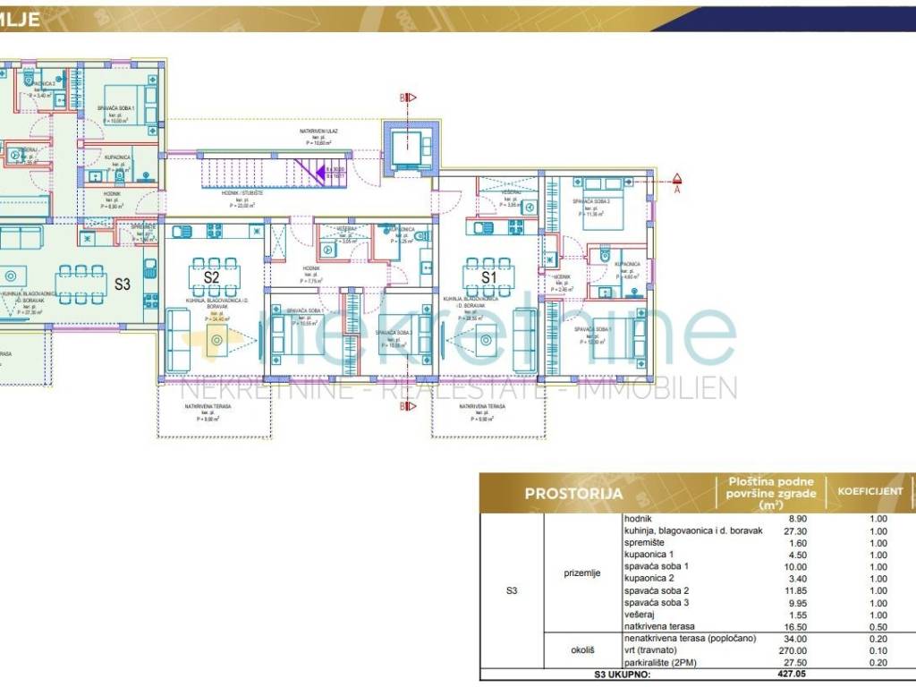 Sobe: 3 spavaće sobe, 2 kupaonice, dnevni boravak, kuhinja, hodnik, vešeraj, blagavaona