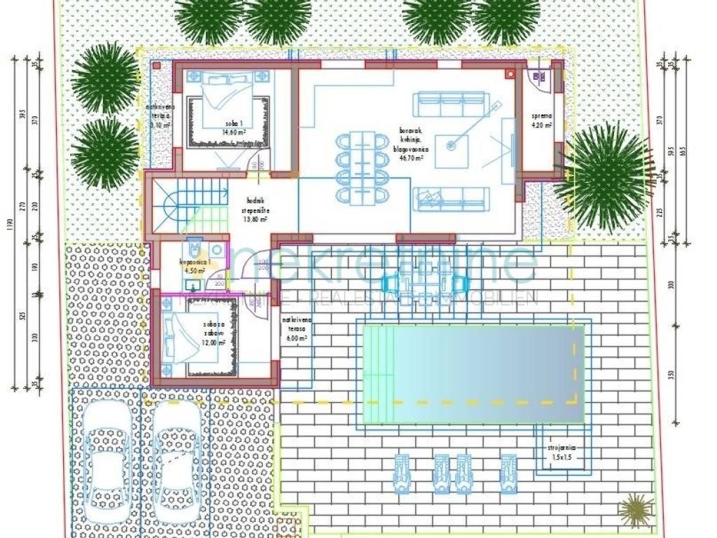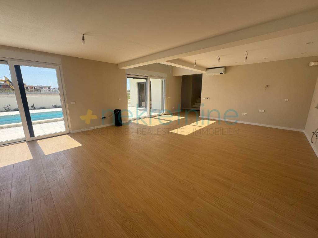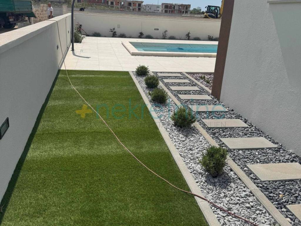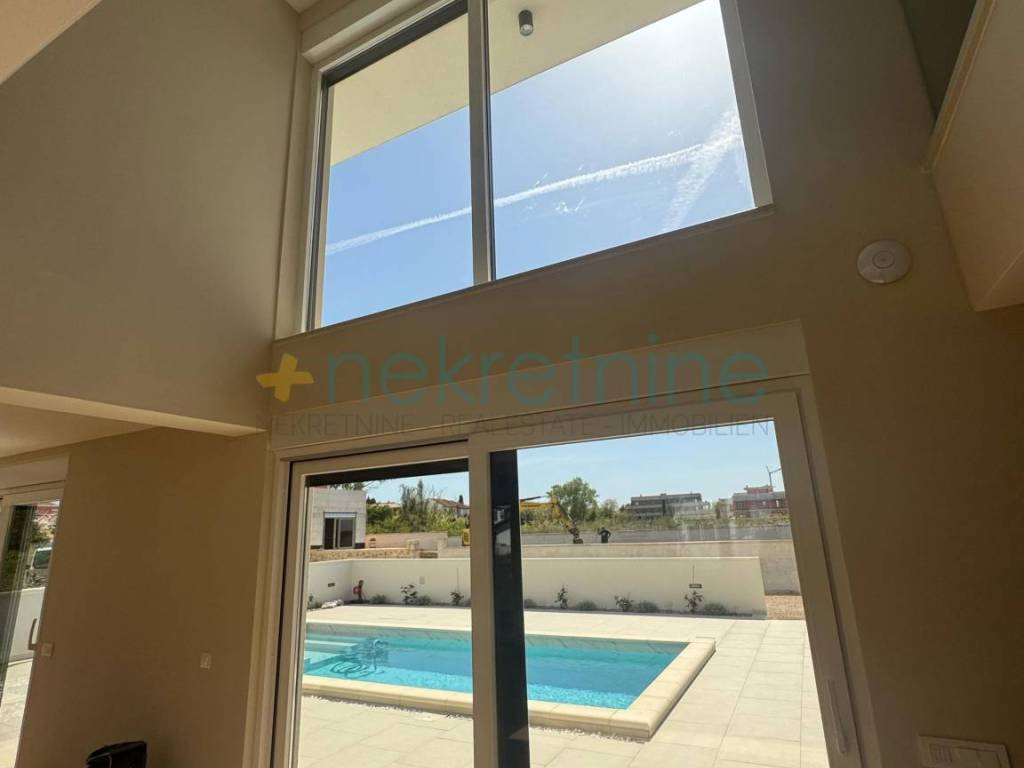 Dvije natkrivene terase (3,1 m i 6 m), s izlazom na vanjski prostor s bazenom (8 x 3,5 m) i ljetnom kuhinjom s kaminom