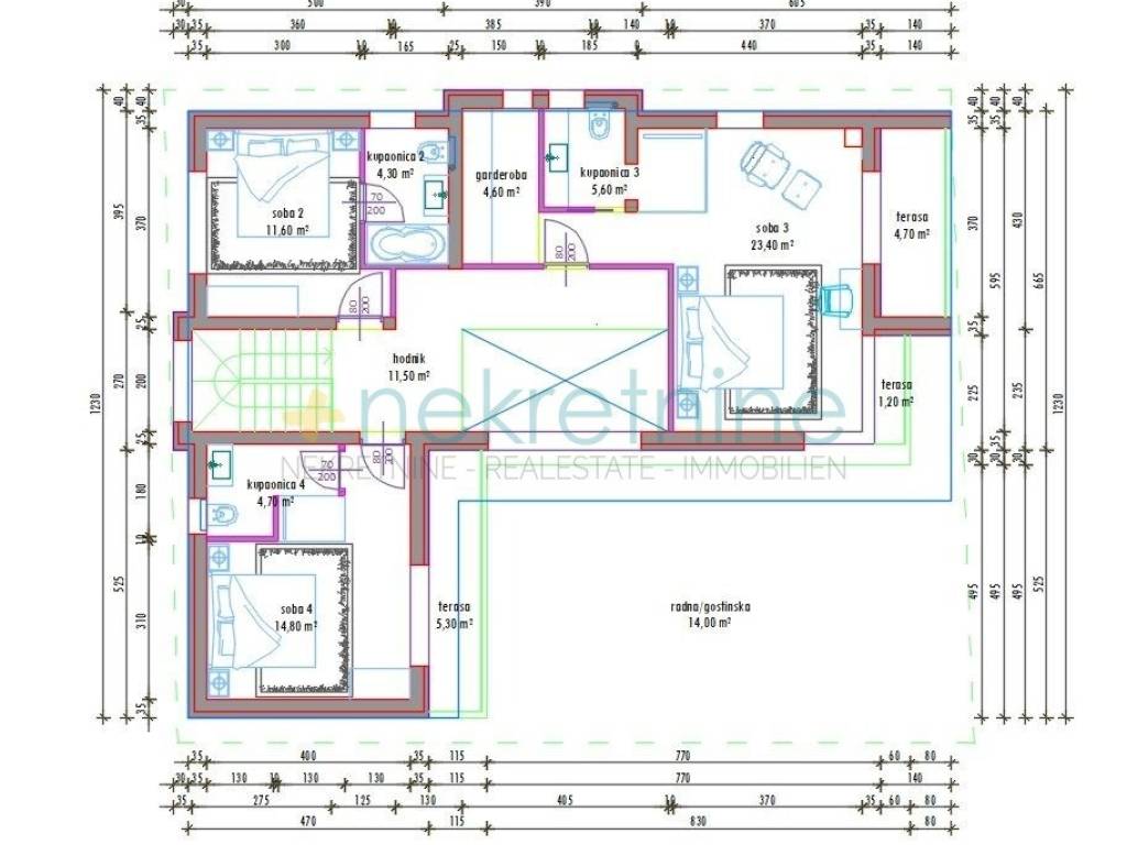 Vila se prostire na 188 m neto površine, smještena na zemljištu od 448 m. Sastoji se od dvije etaže povezane unutarnjim stubištem.