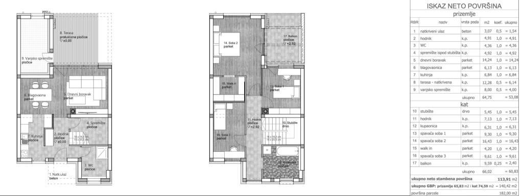 Varaždin, Texas stambena jedinica koja se nalazi u sklopu 6 kuća u nizu NKP 113,91m² s vlastitim vrtom i dva parkirna mjesta.Prizemlje sadrži dnevni boravak spojen s blagovaonicom, kuhinju, hodnik, odvojeni wc, spremište ispod stubište, a iz dnevnog dijela izlazi se na terasu i vrt. Na katu se nalazi master spavaća soba s walk in ormarom, dvije dječje sobe, kupaonica i balkon.Oprema:dizalica topline/podno grijanjeklima jedinice na obje etažePVC stolarija bijele boje sa troslojnim IZO staklimulazna protuprovalna vratapodne obloge kombinacija keramike i parketStanu pripada vrt od cca. 100 m² koji se dodatno cijeni po 150 EUR/m².Rok useljenja krajem 2026.Za više informacija slobodno nas kontaktirajte!