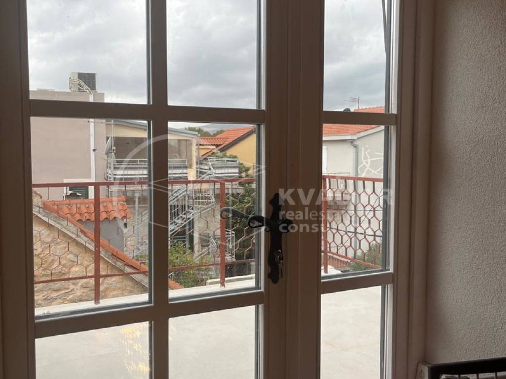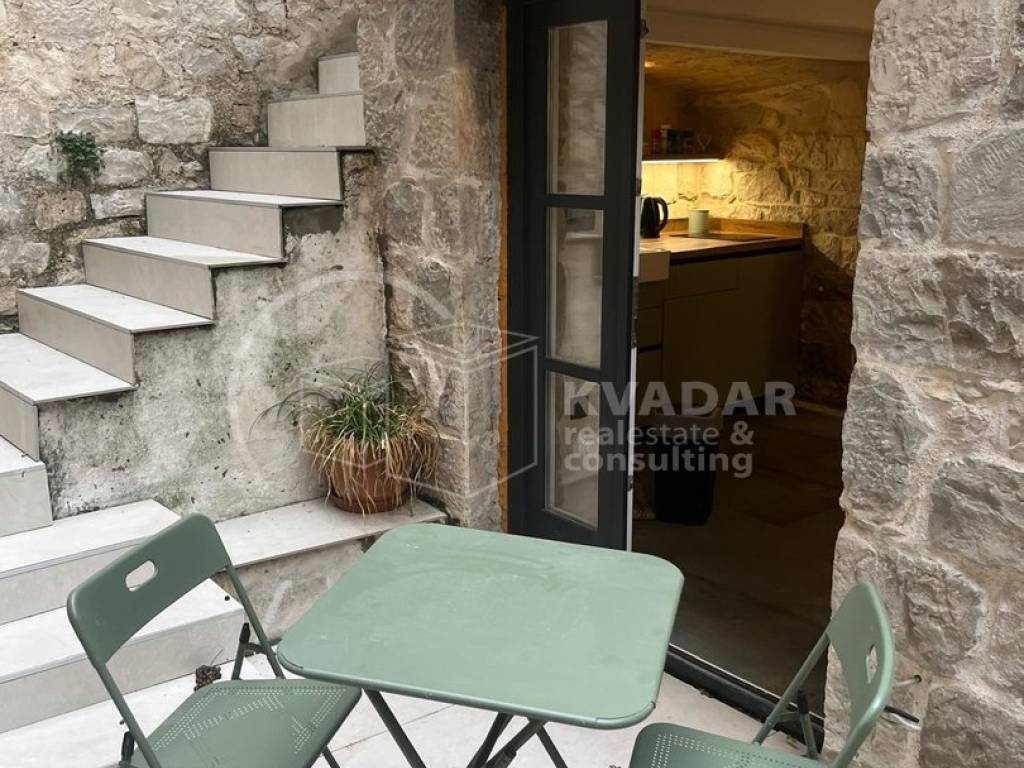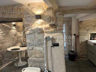 Vanjskim, kamenim stepenicama dolazi se na prvi kat , te se ulazi u dvoetažni  open space apartman koji na tom katu sadrži kuhinju sa trpezarijom, dnevni boravak i kupatilo sa kadom i tušem. Unutarnjim stepenicama od kovanog željeza penje se na slijedeću etažu, tj. galeriju, sa koje se izlazi na terasu odakle se pruža lijepi pogled na more i okoliš. Na galeriji se može organizirati spavaći prostor.