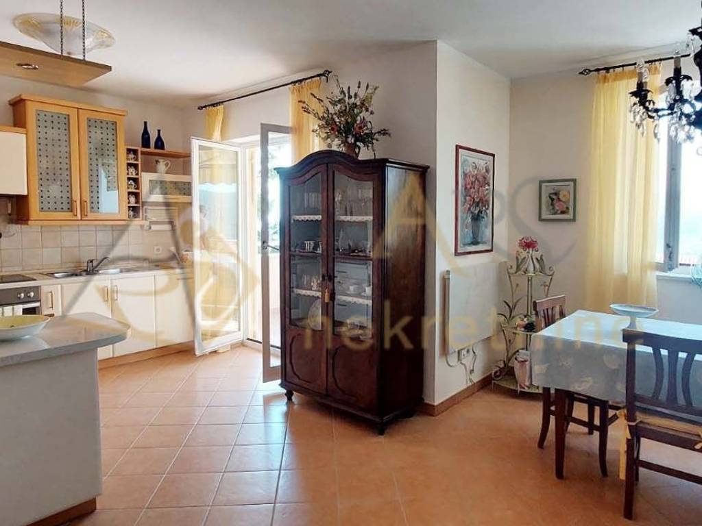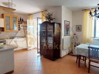 This charming apartment offers two bedrooms, a bathroom with a shower, an open-concept living room, dining area, and equipped kitchen. The kitchen opens onto a terrace with a beautiful sea view.