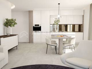 L'appartamento al piano terra, con una superficie abitabile di 87 m, è composto da un ingresso, cucina, sala da pranzo e soggiorno open space con accesso a una grande terrazza, due camere da letto con bagno privato, una stanza di servizio e un WC.