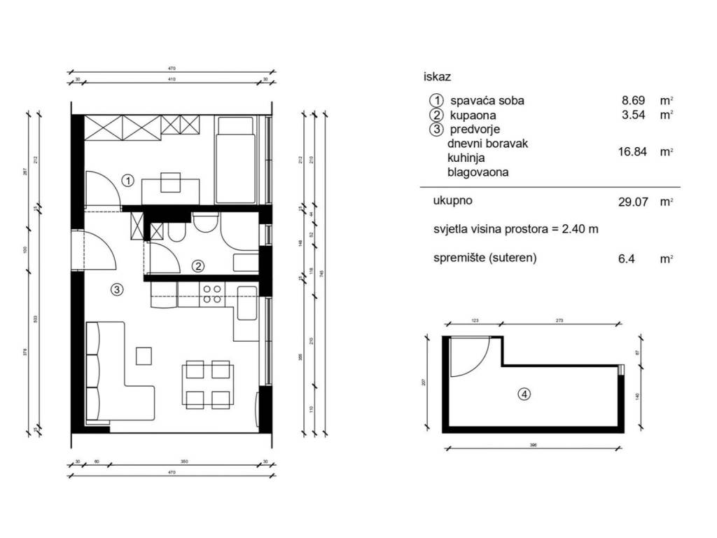 Stan je super funkcionalan i ima površinu od 29,00 m2, a pripada mu i podrum od 6,40 m2. U zgradi je smješten iznad dva stana tako da ima dobru izolaciju.