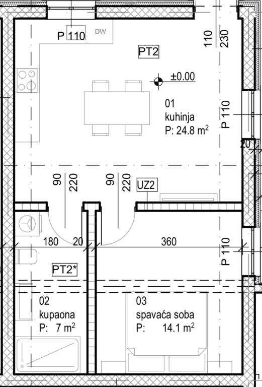 Podijeljen je na kuhinju s blagovaonicom, spavaću sobu i kupaonicu.Vanjsko parking mjesto je uračunato u cijenu.