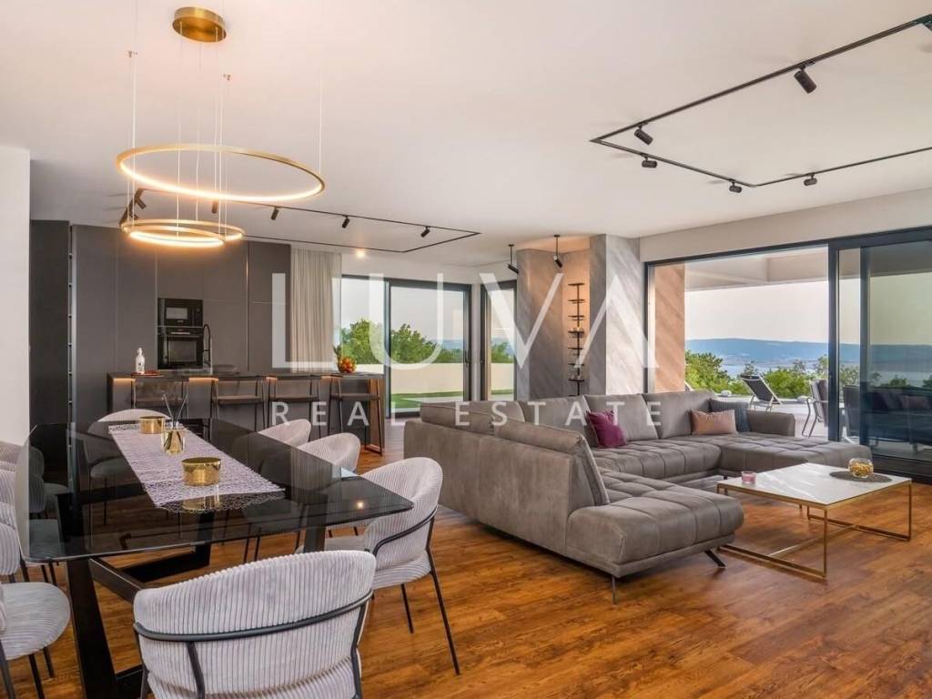 For sale: luxury villa with stunning sea views in the peaceful area of Jadranovo, near Crikvenica. Built in 2024, the villa sits on a 1300 m² plot and covers 400 m² over 2 floors. The ground floor features a fully equipped modern kitchen and a spacious living room with large glass doors leading to a terrace with an outdoor pool.