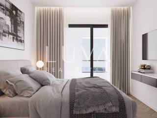 The apartment is on the floor that is the 2nd floor from the street level, but partially underground from the rear side. The apartment has a net area of 80 m² and a gross area of 89 m², consisting of an entrance hallway, 2 bedrooms with en-suite bathrooms, and a spacious living room connected to the kitchen, which opens onto the loggia. The apartment includes a garage parking space.