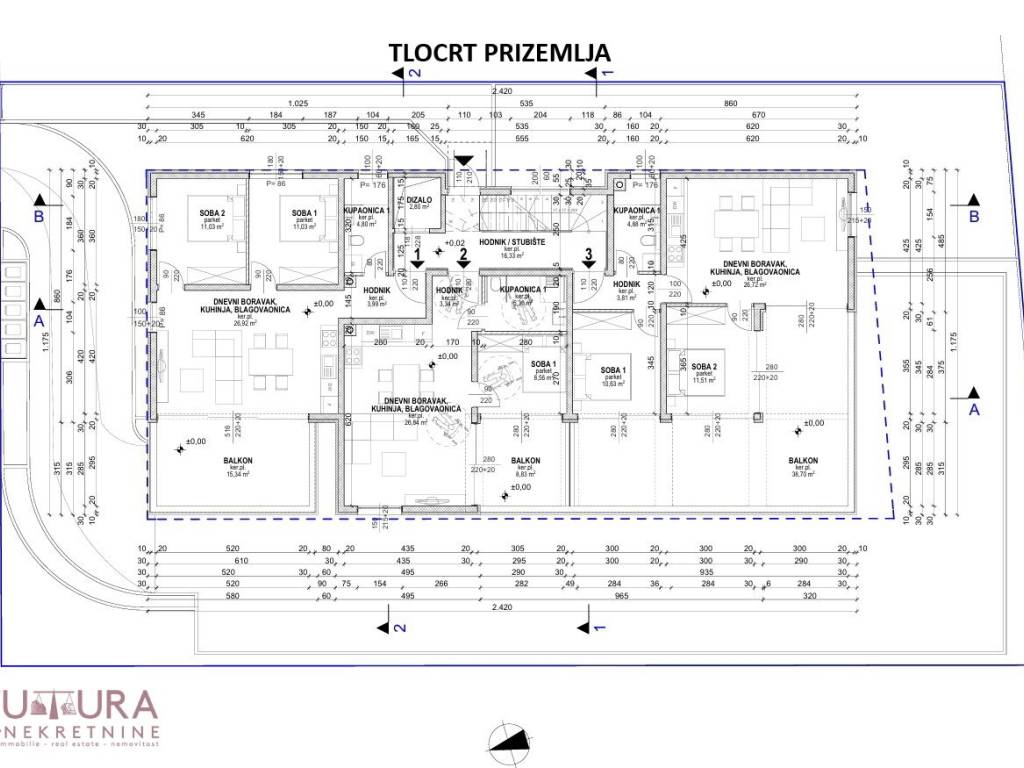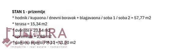 Sastoji se od: dvije spavaće sobe, dnevnog boravka + kuhinja + blagovaona, hodnika, kupaonice i terase.