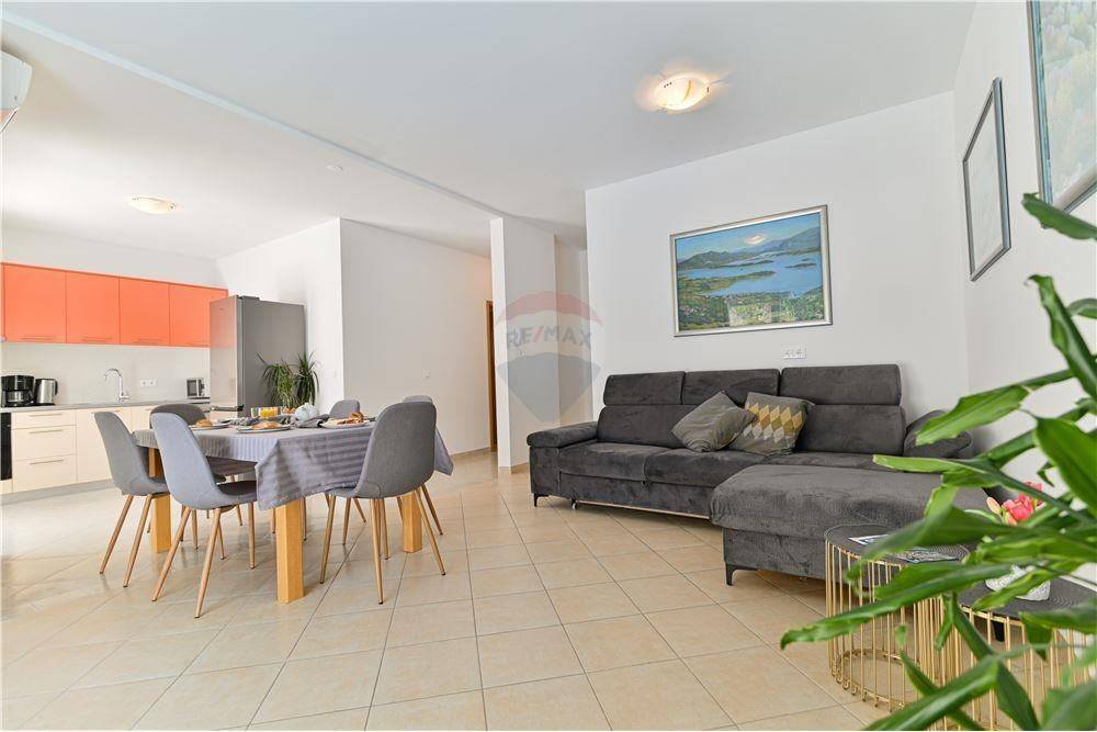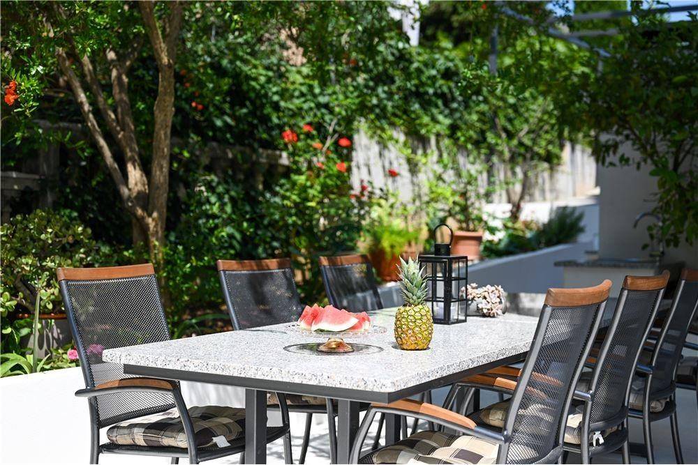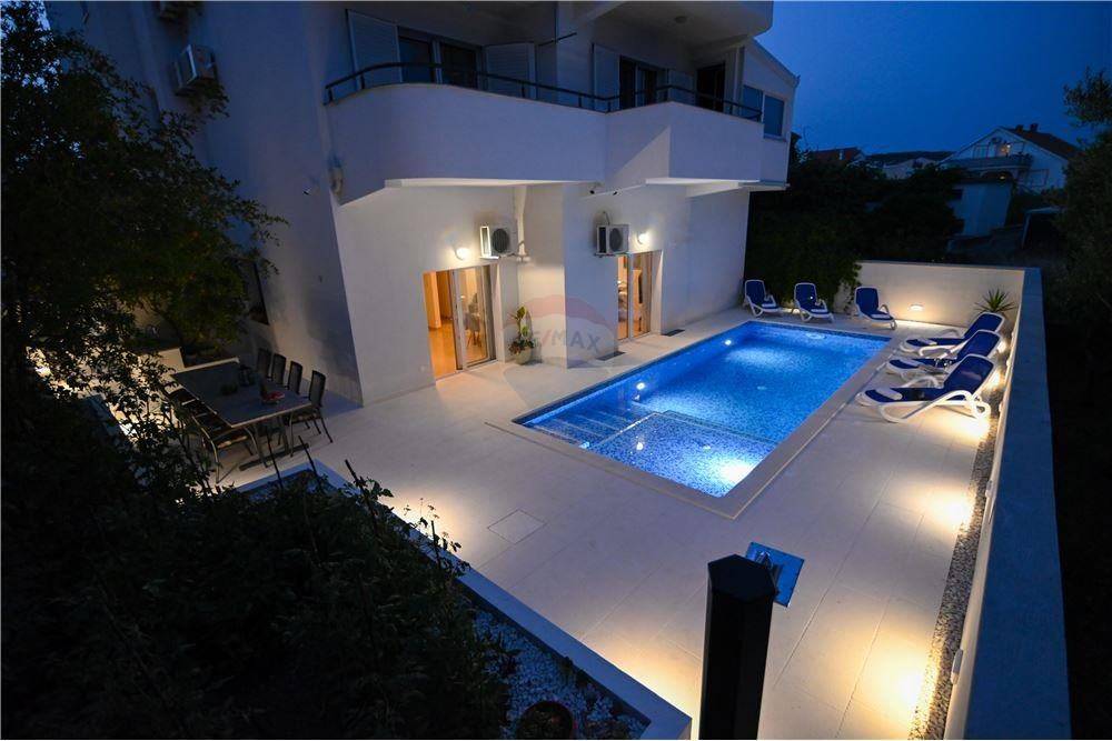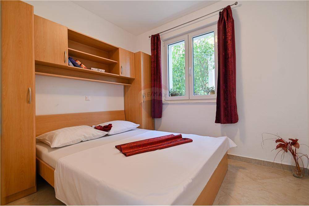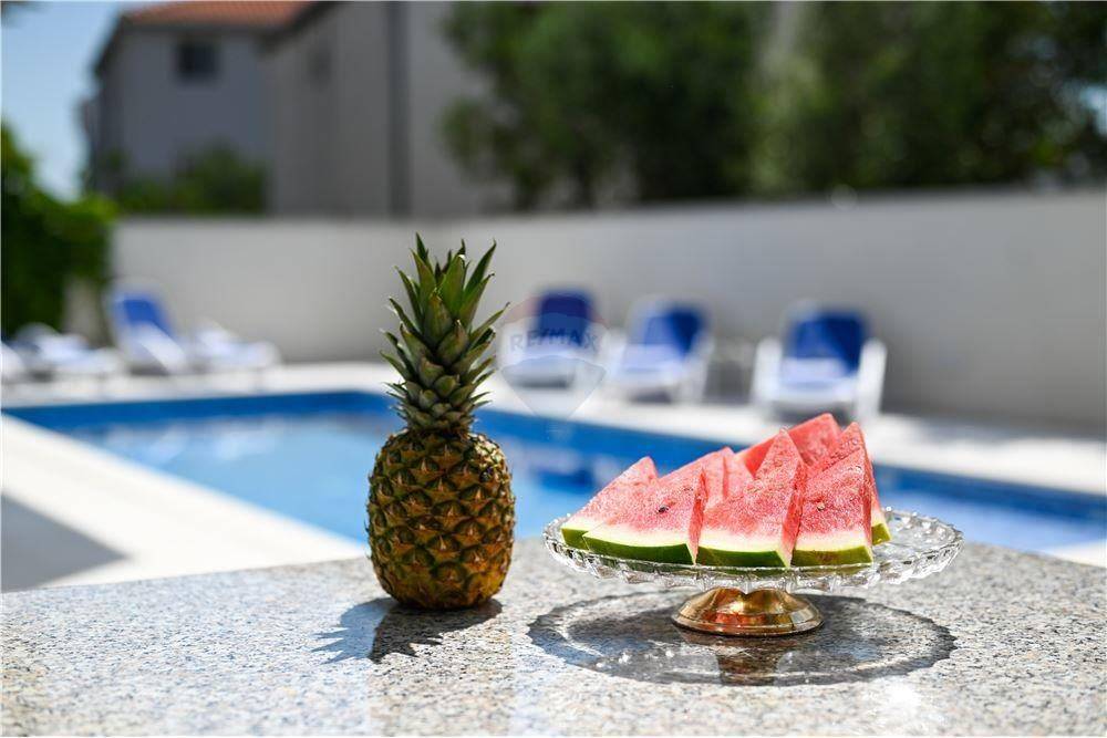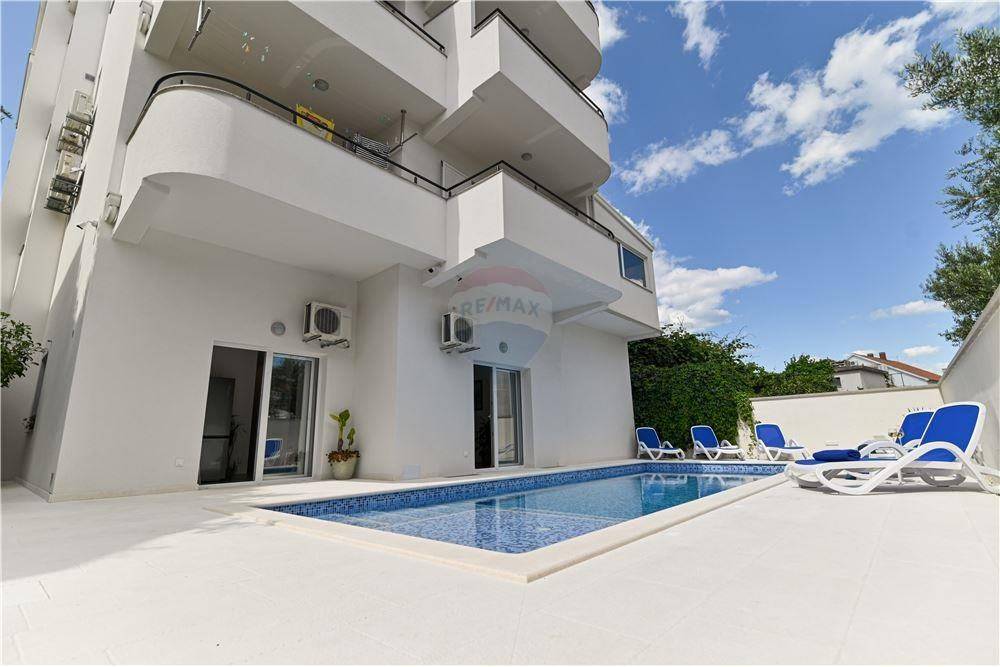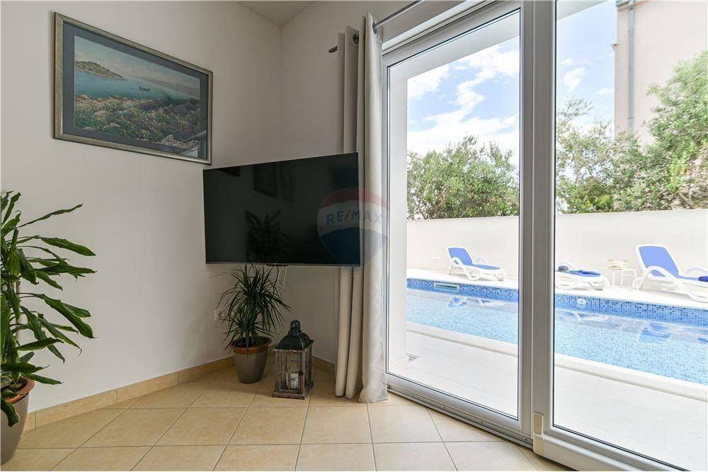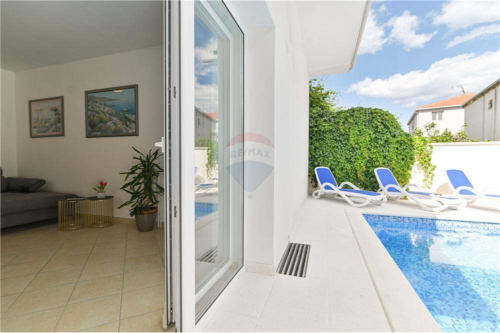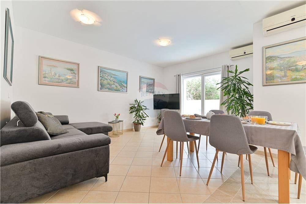 Na prodaju je veliki stan u prizemlju - manje stambene zgrade u Okrugu Gornjem, otok Čiovo, s pripadajućim velikim vlastitim vrtom s bazenom, konobom u podrumu i dva parking mjesta.