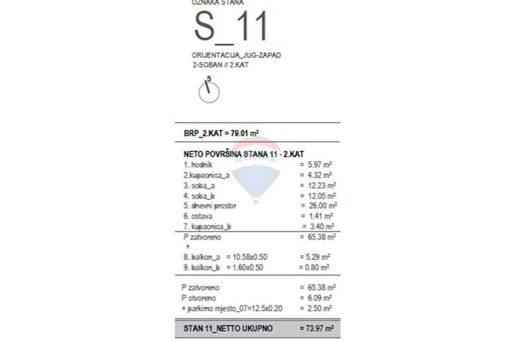 Prodaje se stan na drugom katu moderne stambene zgrade u izgradnji završetak radova planiran do kraja 2026. godine. Zgrada ima ukupno 14 stanova i gradi se po visokim standardima (energetski učinkovita fasada, PVC stolarija s troslojnim staklom, kvalitetna keramika, podno grijanje u kupaonicama, klima uređaji).