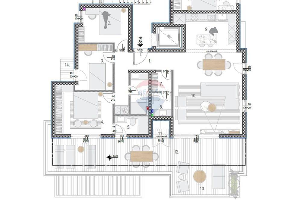Sastoji se od: hodnika, 3 spavaće sobe, 2 kupaonice i 1 wc-a, prostranog dnevnog boravka s kuhinjom i blagovaonicom, 2 balkona