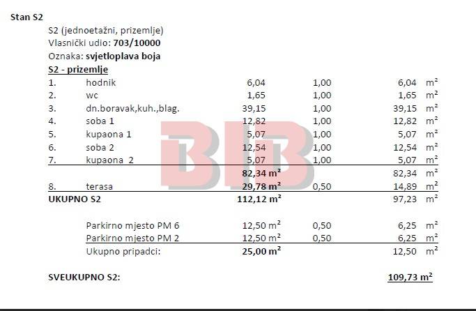 Stan se sastoji od hodnika,dvije spavaće sobe,dnevnog boravka sa kuhinjom i blagovaonicom,dvije kupaonice,wc-a,balkona,te 2 garažna mjesta površine 12,50M2 I 12,50M2