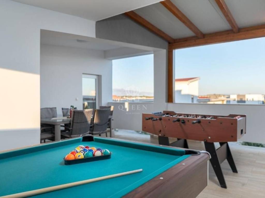 U prizemlju objekta smještena je kuhinja, prostrani dnevni boravak, kupaonica, dvije spavaće sobe, natkrivena terasa sa roštiljem, unutarnji bazen površine 20m2, wc i tuš u prostoriji sa bazenom te ostava i strojarnica kuće.
