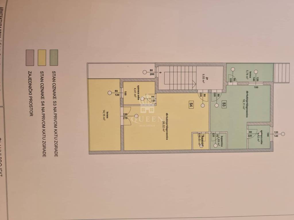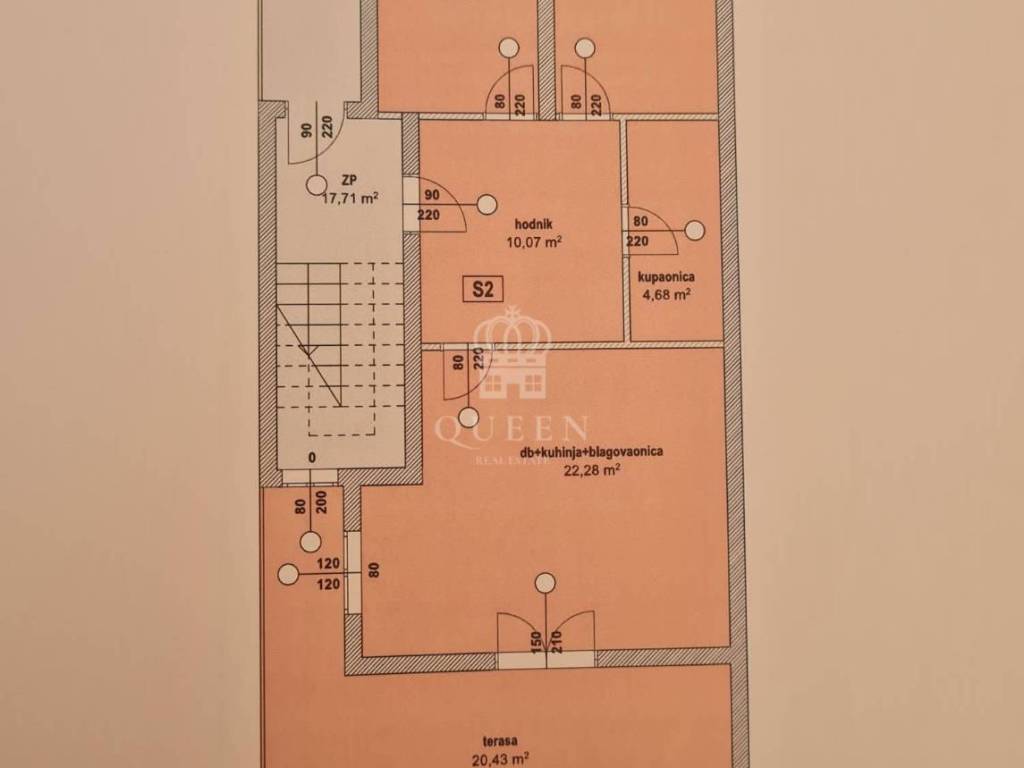 stan s2) površine 75,69m2 koji se sastoji od kuhinje spojene sa dnevnim boravkom, hodnika, kupaonice, 2 bračne spavaće sobe te prostrane natkrivene terase koja ima 20,43m2