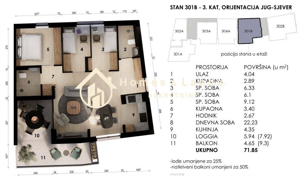 ČETVEROSOBAN STAN stan površine 71,85 m2(301B) na 3.katu B zgrade, orijentiran istok-zapad sastoji se od ulaznog hodnika, kuhinje s blagovaonicom, dnevnog boravka, tri spavaće sobe, dvije kupaonice i prostranog balkona.