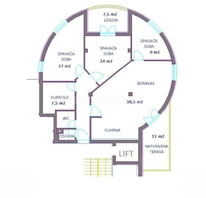 Stan se sastoji od ulaznog hodnika , 1 kupaonice, 1 toaleta, ostave , 3 spavaće sobe od kojih jedna soba ima izlaz na vlastitu loggiu, te od prostranog dnevnog boravka, kuhinje i blagovaonice sa izlazom na veliku natkrivenu terasu.
