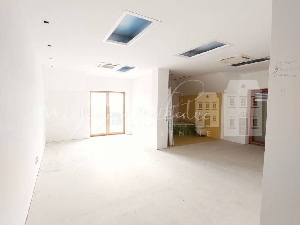 Prizemlje: prostrani hodnik, te veliki open space kojega čine kuhinja, blagovaona, 3 stepenice niže je dnevni boravak sa kaminom i velikim staklenim stijenama zbog kojih je kuća puna prirodnog svijetla, dodatne prostorije koja je prvotno bila zamišljena kao prostorija za dječji dnevni boravak, igraonu ali može biti i u funkciji kućnog ureda te gostinjski wc.