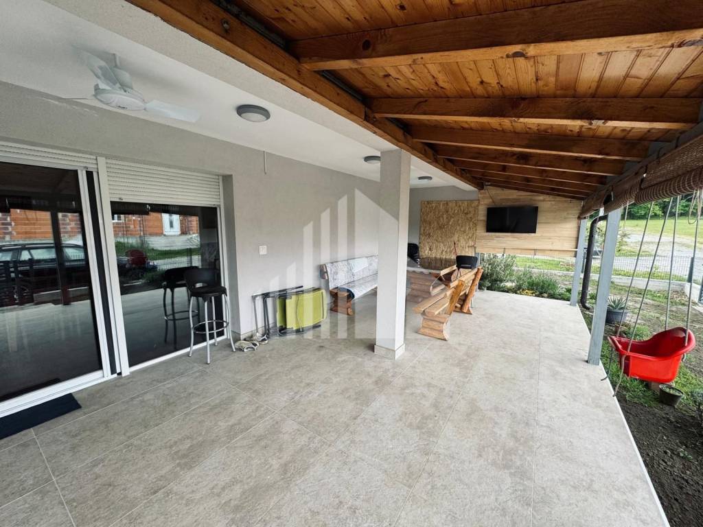 Oprema: termofasada 15cm, PVC stolarija, kvalitetno krovište, centralno grijanje na plin i drva, unikatno stepenište od punog drva, kamin.