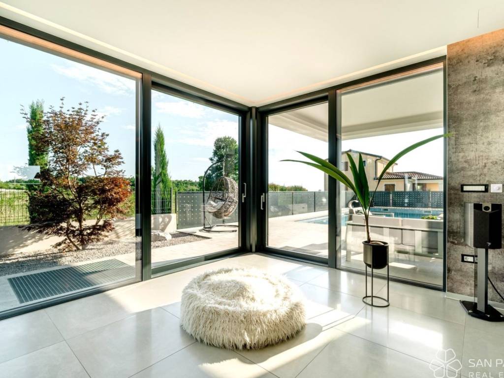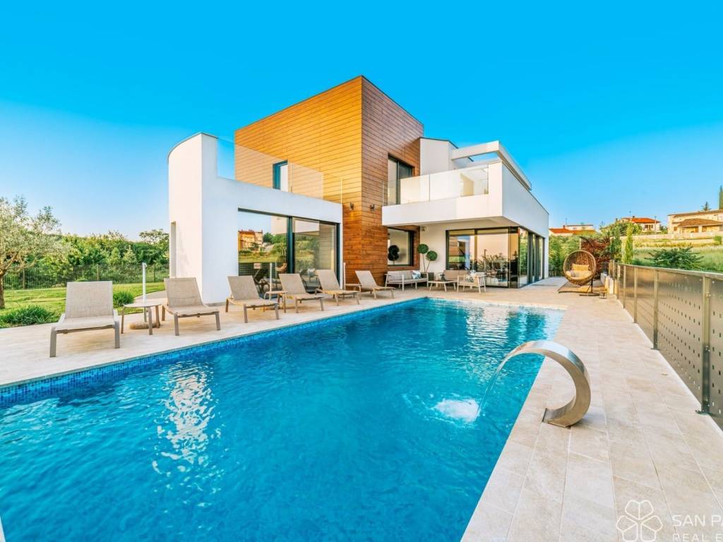 On a plot of 650 m2 for sale is a designer villa with a total area of 370 m2 which on three floors (basement, ground floor and first floor) consists of 4 bedrooms, walk-in closet, 3 bathrooms, 4 terraces, 2 kitchens, private outdoor pool, large living room and dining room with fireplace, tavern, study room, lush garden with automatic watering system, 3 parking spaces.
