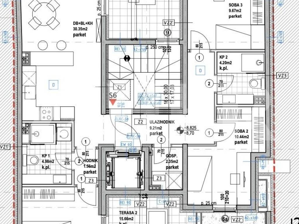Apartment S6: living room with dining room and kitchen, three bedrooms, storage room, two bathrooms, total area 85,13 m2 + terrace 17 m2 + terrace 16 m2 = 435.000 eur