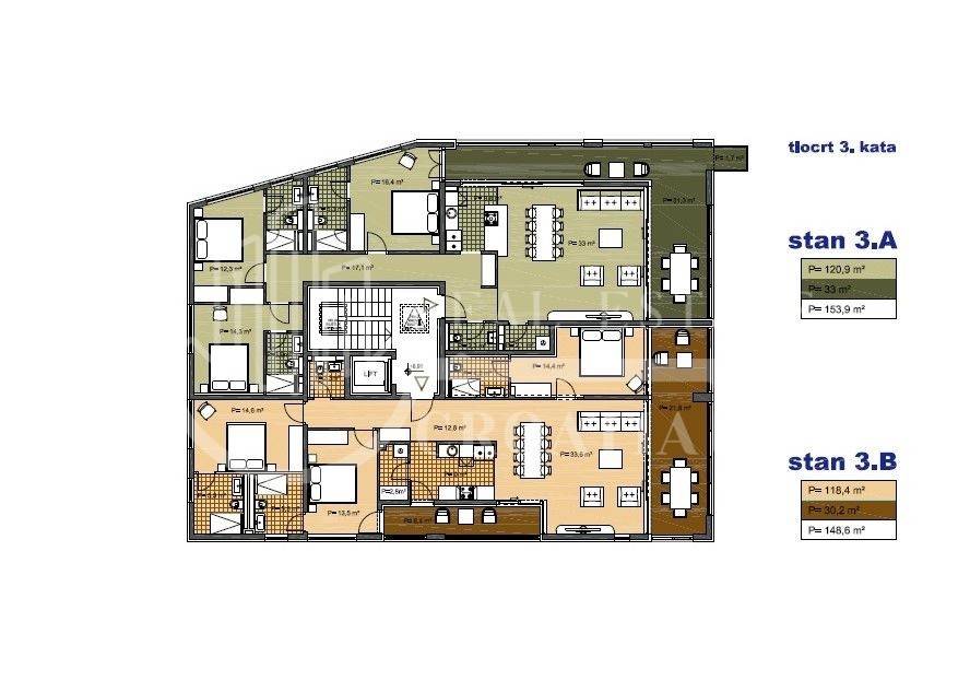 Ukupno 6 trosobnih stanova, svaki sa 120 m stambenog prostora i 31 m balkona.