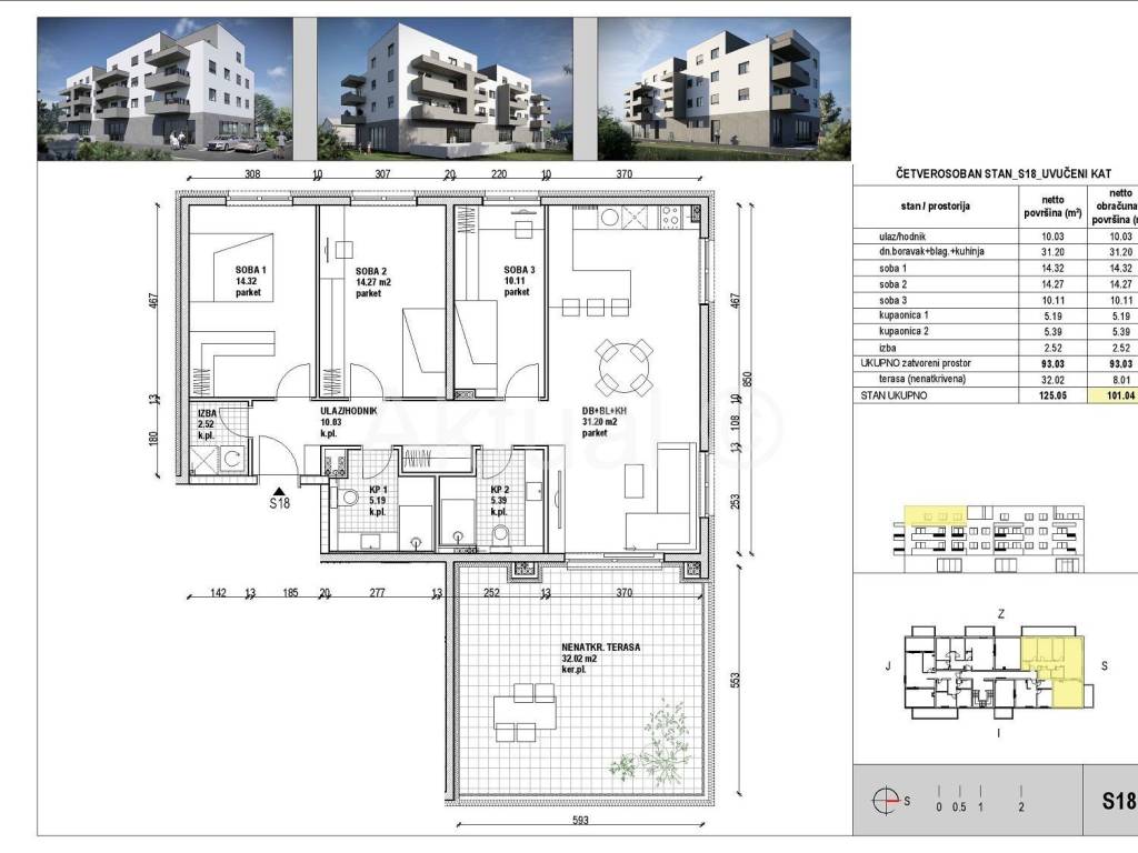 Stan oznake S18 nalazi se na zadnjem katu zgrade, ukupne površine 101.04 m2 a sastoji se od ulaznog prostora/hodnika, kuhinje, blagovaonice i dnevnog boravka, 3 sobe, 2 kupaonice, izbe i terase.