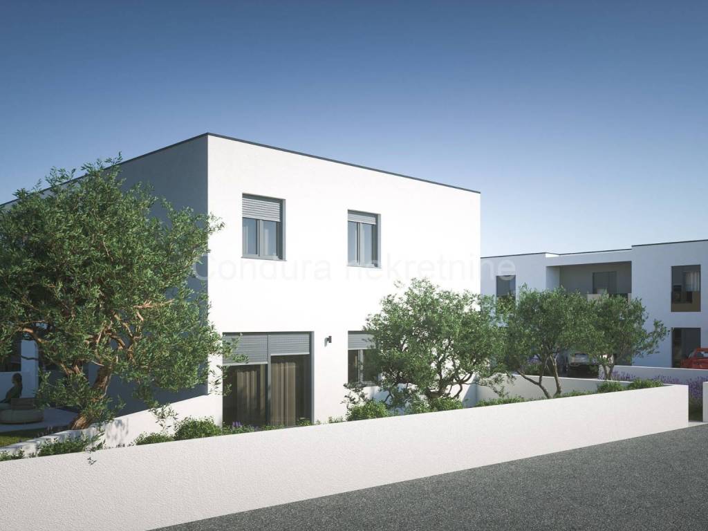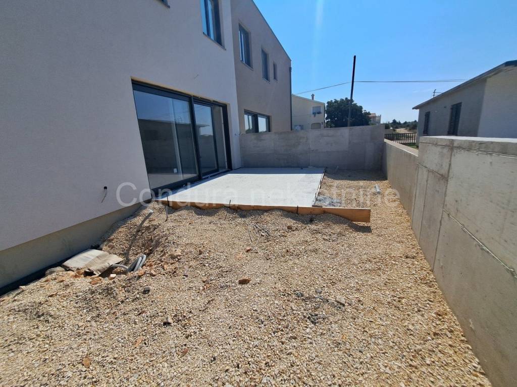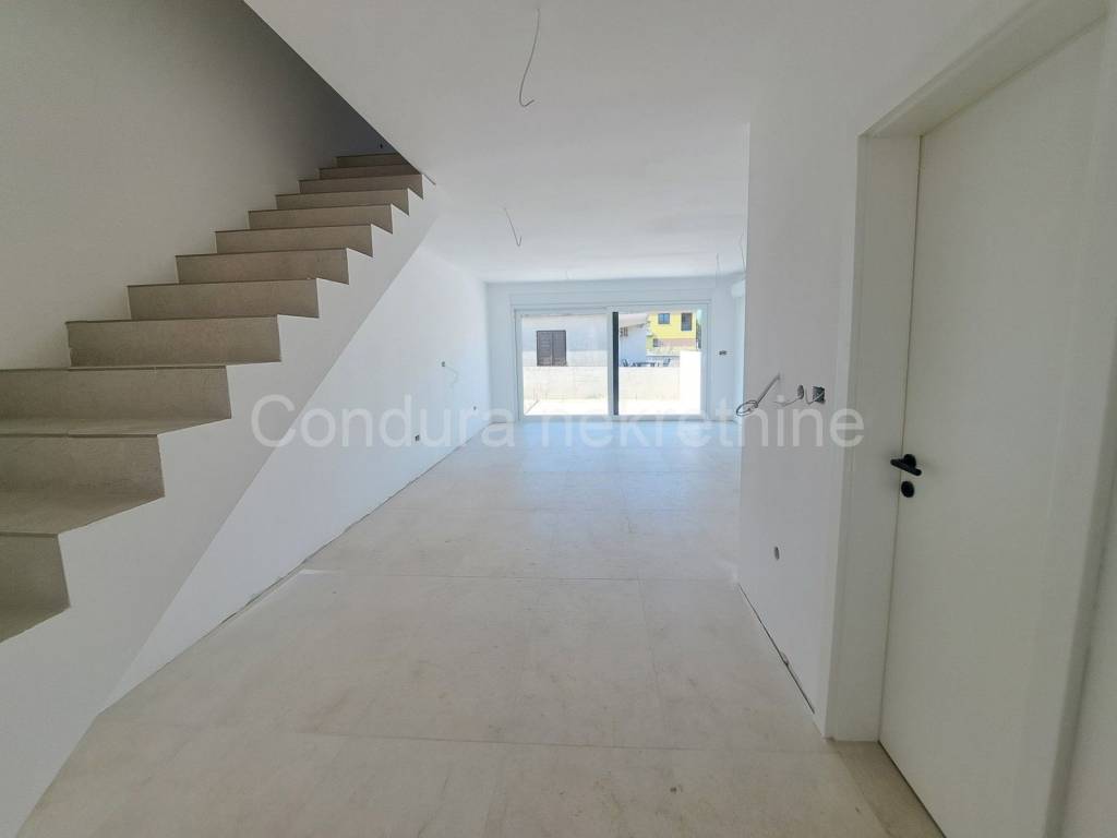 The ground floor consists of a bathroom, living room, and kitchen. An internal staircase leads to the first floor, where there are three bedrooms and a bathroom. The house also includes 2 parking spaces in the courtyard.