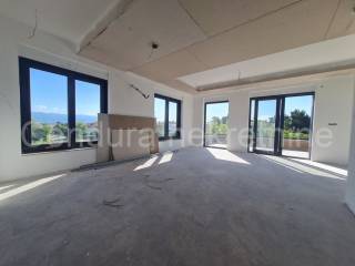 From the living room and dining room there is a balcony with an area of 26.78 m2, from which an external staircase leads to a large roof terrace with an area of 102.29 m2, which has a view of the sea.