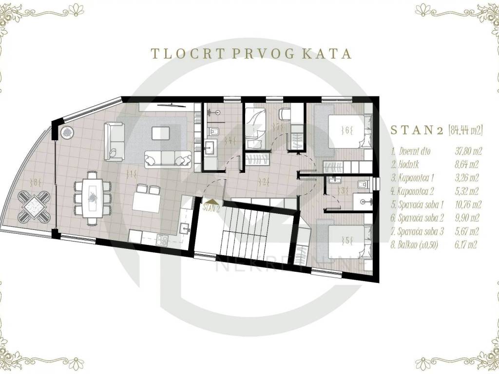Prodaje se stan na 1. katu moderne novogradnje u Podstrani, obračunske površine 97,47 m2.
