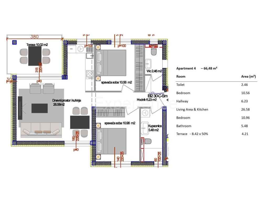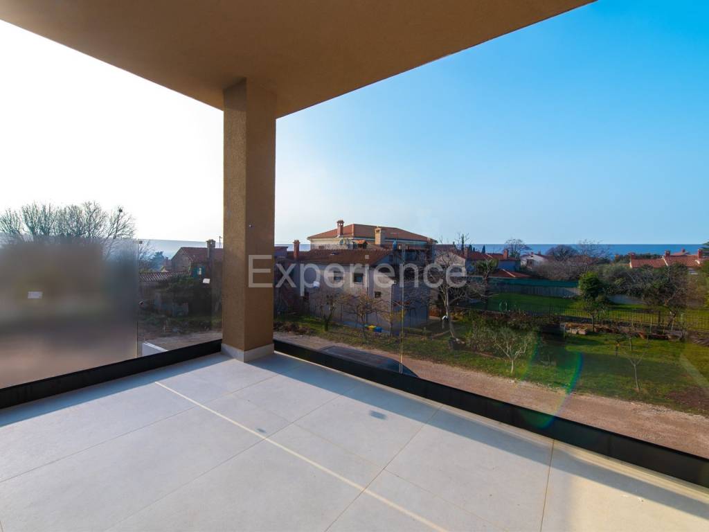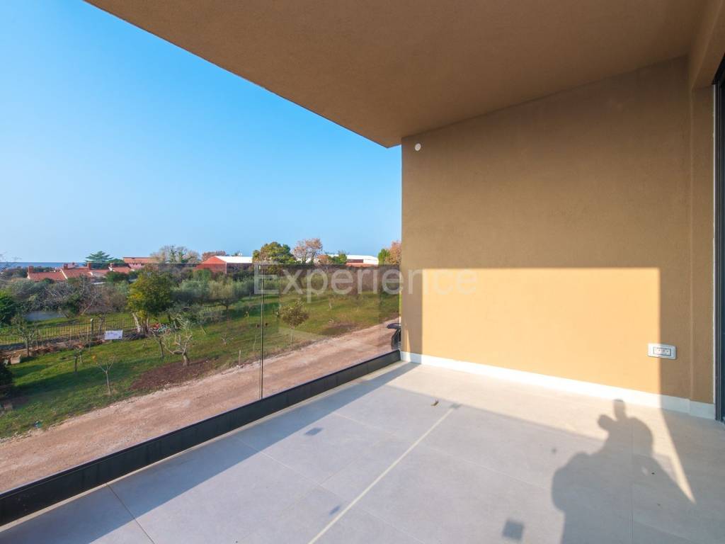 Vicino a Parenzo - a circa 1.800 m dal mare, in una posizione molto tranquilla è in vendita un appartamento in un nuovo edificio con la superficie di 67,28 m. L'appartamento è situatoal primo piano di un edificio residenziale. Comprende: corridoio, spazio aperto e luminoso che unisce soggiorno, cucina e zona pranzo con accesso ad una spaziosa terrazza coperta (10 m), due camere da letto, bagno e toilette. Ledificio è dotato di ascensore.