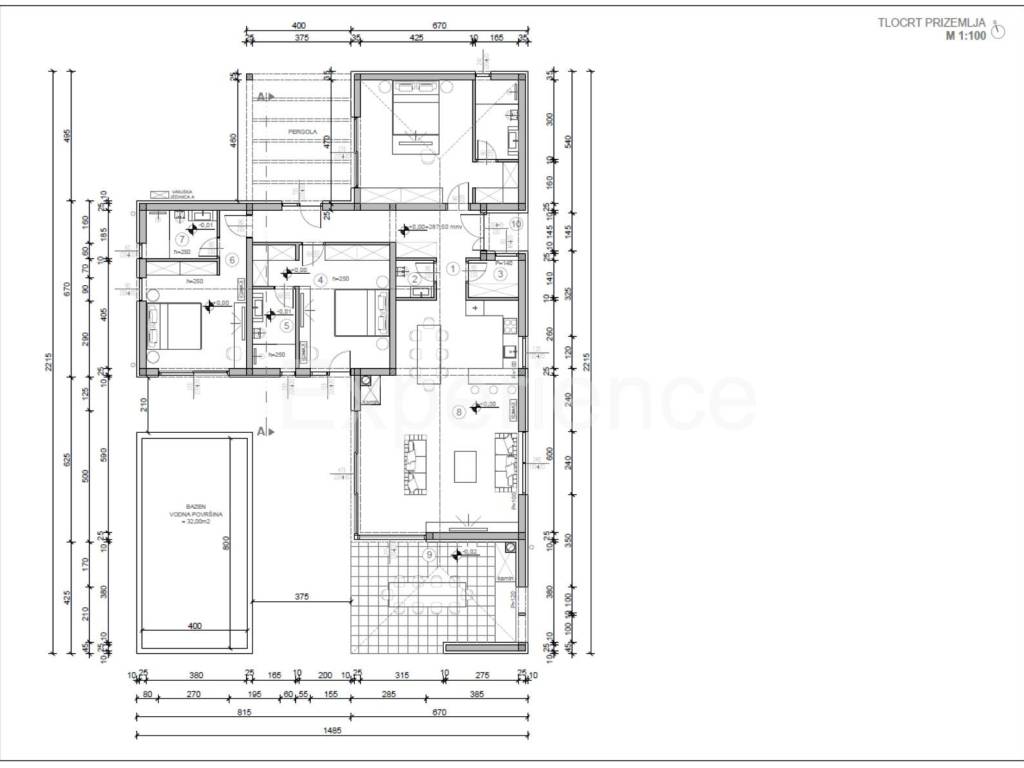 Tutta la zona abitativa si sviluppa su un unico livello, con una superficie netta di 156 m. Larea esterna comprende una piscina di 32 m con zona prendisole e spaziosa terrazza coperta (25,17 m) con cucina estiva perfetta per vivere in armonia con la natura.